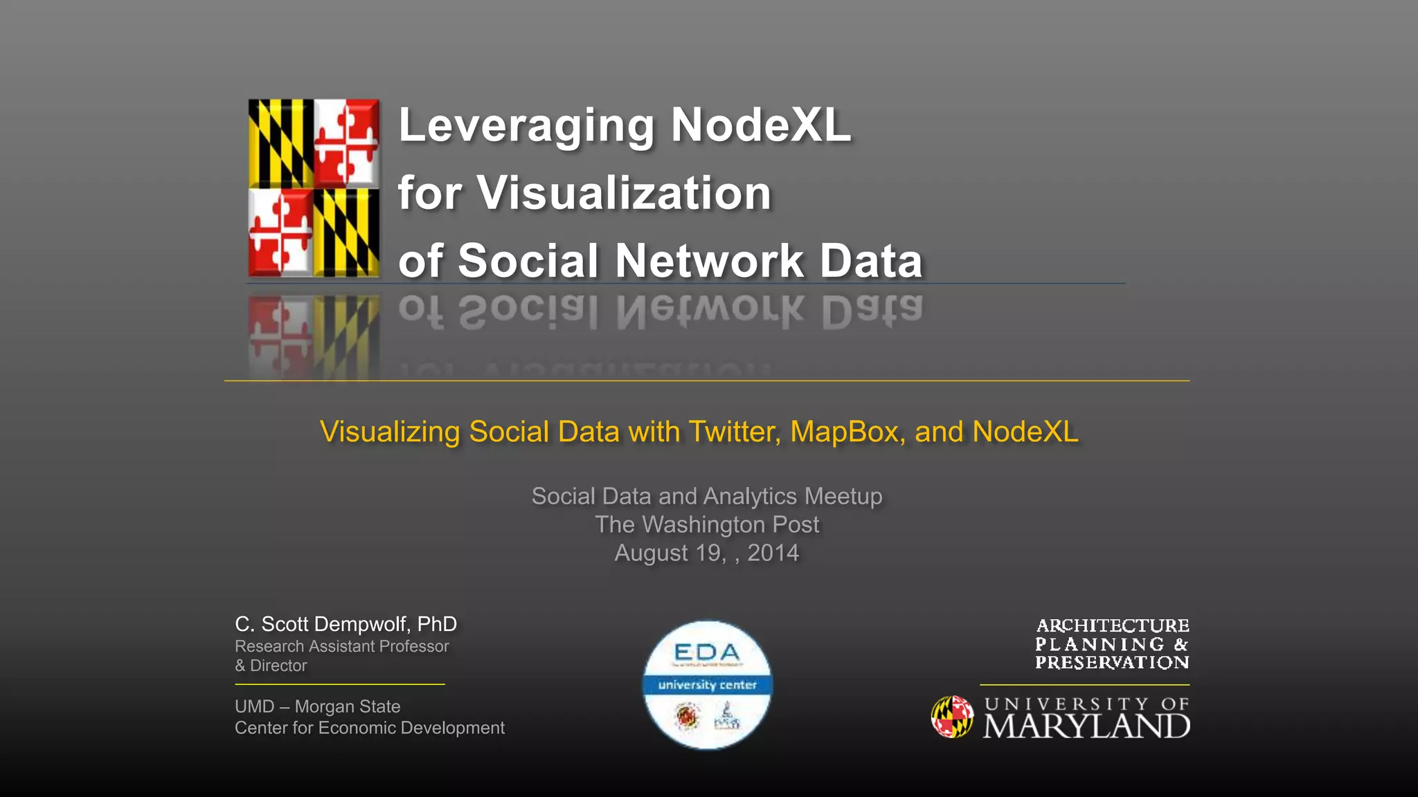 This document summarizes a presentation about using NodeXL to visualize social network data from Twitter, MapBox, and other sources. It introduces NodeXL as a free and easy-to-use tool for social network analysis built on Excel. The presentation discusses key concepts in social network theory like nodes, edges, centrality, and clustering. It then shows examples of using NodeXL to analyze innovation networks and visualize data from CrunchBase on capital flows between startups, accelerators, and investors. The purpose is to demonstrate how network analysis and visualization with NodeXL can provide insights into clusters and connections in social and innovation ecosystems.