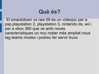 Què és? Elsmackdown vs raw 09 és un videojoc per a psp,playstation 2, playstation 3, nintendo ds, wii i per a xbox 360 que ve amb noves característiques un nou roster més ampliat nous tag teams modes i podreu fer servir trucs
