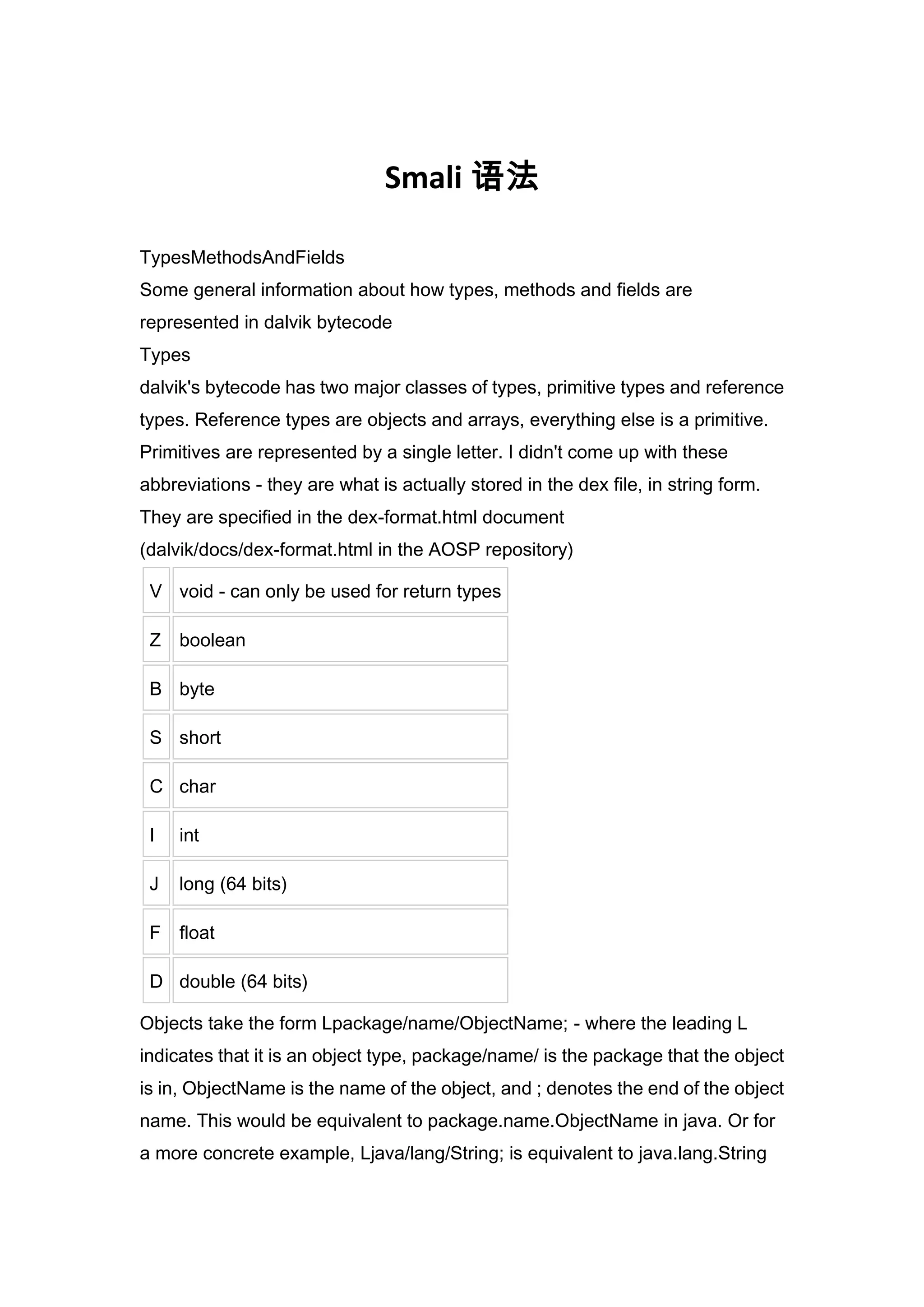 1. Dalvik bytecode represents types as either primitive types represented by single letters (e.g. I for int) or reference types in the form of Lpackage/name/ObjectName;.