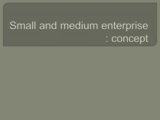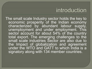 Small scale industries play a key role in India's economic development and industrialization due to their ability to generate large scale employment, require lower investment, and have shorter gestation periods. They account for 54% of India's exports and are important for utilizing India's abundant labor supply. However, they face challenges from globalization and trade agreements that liberalize markets. The document goes on to define micro, small, and medium enterprises based on investment levels and classify them as either manufacturing or service. It discusses the advantages small businesses provide like decentralized development and flexibility, as well as some disadvantages like financial and branding challenges.
