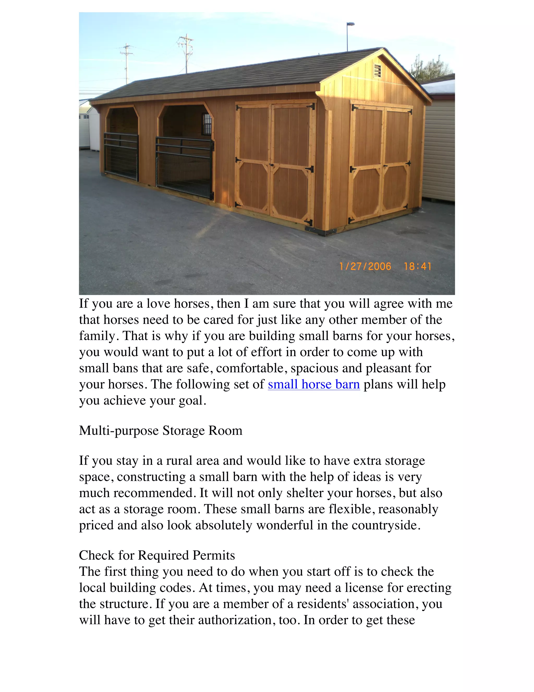 This document provides guidance on building small horse barns. It recommends constructing barns that are safe, comfortable, spacious and pleasant for horses. It suggests checking local building codes and permits, choosing a level location with access to electricity and plumbing, and using a post and beam structure. It also stresses the importance of sufficient aeration, natural light, and safe construction to prevent horse injuries. The overall document offers tips for constructing an affordable yet high-quality small horse barn.