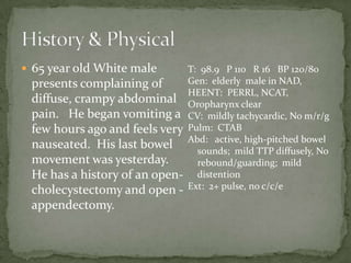 A 65-year-old man presents with diffuse abdominal cramping and vomiting. His abdomen is distended and tender. Imaging shows small bowel obstruction with dilated bowel loops and the "string of pearls" sign. He has a history of prior abdominal surgeries. Based on the history and imaging, this patient likely has a small bowel obstruction requiring further management including IV fluids, decompression, and surgery consultation given his risk factors.