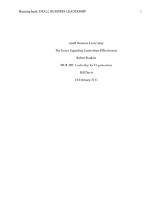 This document discusses leadership issues specific to small businesses. It begins by noting the importance of small businesses to the US economy. It then examines the characteristics and personality traits needed for effective small business team leadership, noting time constraints small business leaders face. The document also discusses various leadership theories and styles, particularly highlighting how the situational leadership approach of Hersey and Blanchard fits well for small businesses due to the close relationships between leaders and followers. It concludes by exploring the power and influence small business leaders have over subordinates.