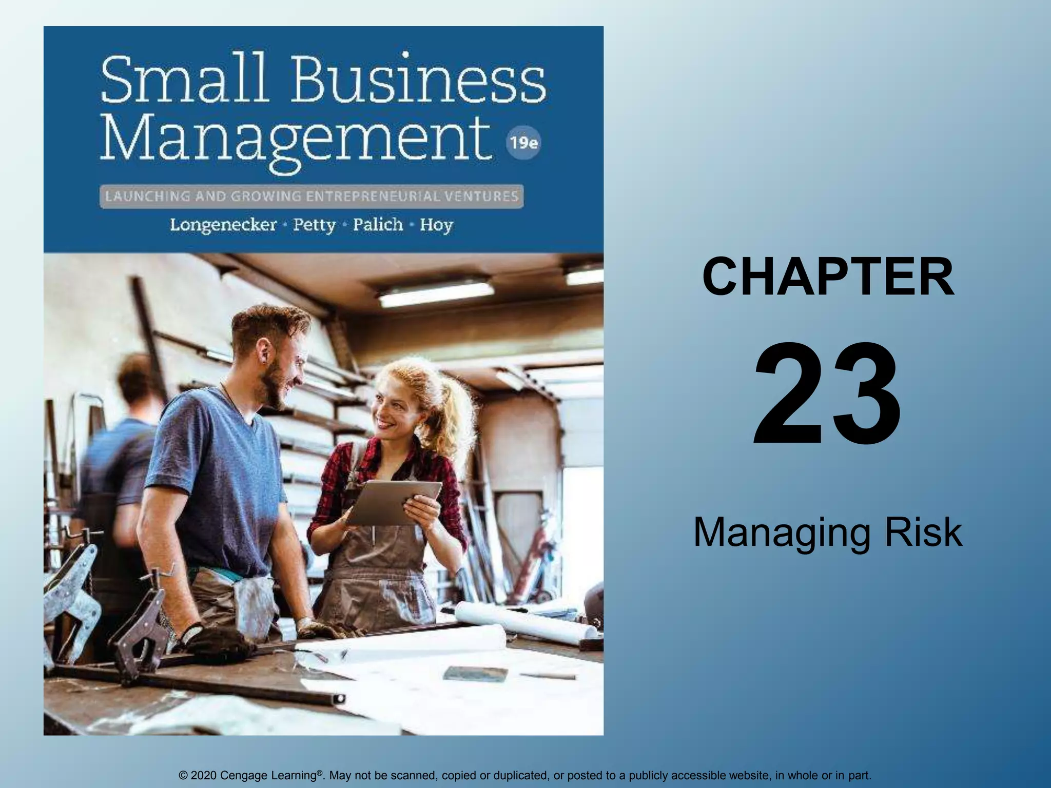 This document discusses managing risk for businesses. It covers defining business risk, identifying types of pure risk like property, liability and personnel risks. It then describes the risk management process of identifying, evaluating and selecting methods to manage risks through risk control or risk financing. Specific insurance policies for property, casualty, life and health are also summarized. The key aspects of risk management and common insurance coverage for businesses are outlined.