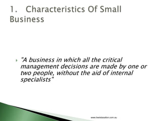This document discusses common challenges faced by small businesses. It notes that 95% of businesses are small, with critical decisions made by one or two people without specialists. Some key challenges include inadequate planning, lack of professional advice, insufficient capital, poor management skills, and neglecting the business. As a result, 75% of small businesses fail within three years. Common reasons for failure include cashflow issues, lack of strategic planning, poor record keeping, and not understanding the market or customers. The document emphasizes the importance of seeking professional advice and support for small business owners.
