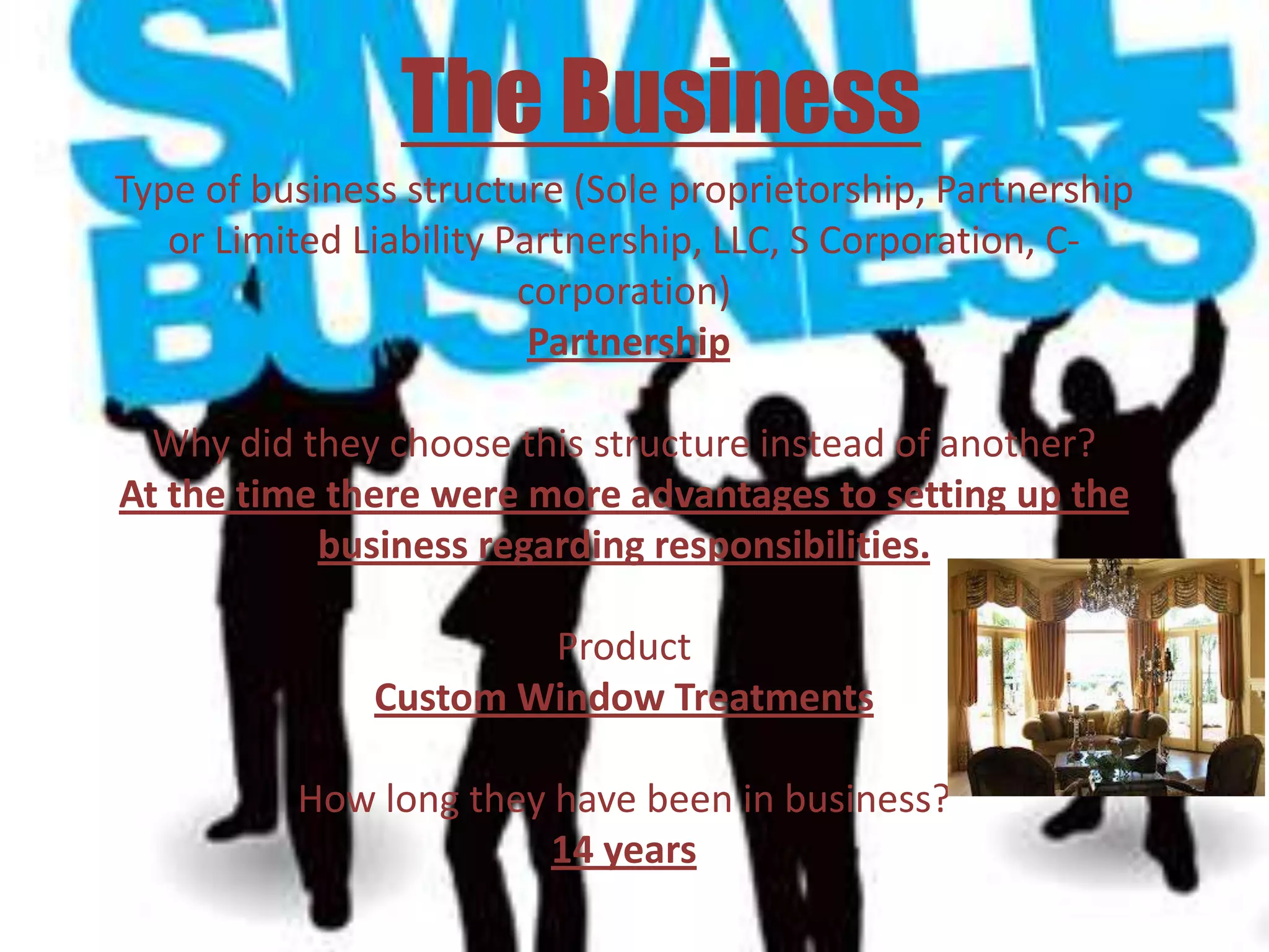 Cindy Solomon owns Accent Interiors, a 14-year-old custom window treatments business that she started as a partnership. It provides custom window treatments and has grown through word-of-mouth over the years. While the business has slowed down due to the economy, Cindy finds the most rewarding part to be happy customers. She plans to maintain the business's high quality reputation going forward.