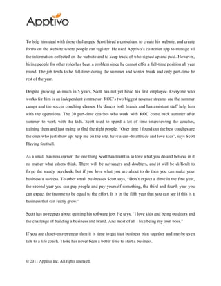 Scott Wilkinson quit his 150k/year software job to follow his passion of working with kids outdoors. He started the Kids Outdoor Club (KOC) 5 years ago to offer outdoor after-school programs with little competition. Starting with $1,000, KOC now has 50 kids in summer camp, 175 in soccer coaching, and 50 families in afterschool programs. As a small business owner, Scott faces challenges of hiring, branding, defining his audience, and sustaining operations year-round.