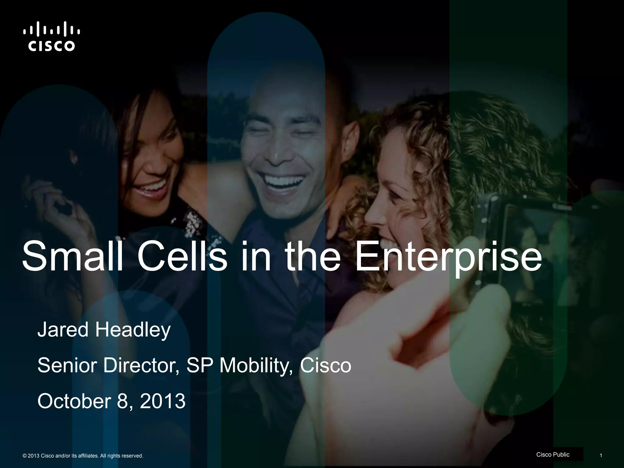 Small cell technology has significantly decreased in cost from $30,000 to $1,000 per unit. Enterprises are demanding small cells to solve voice coverage issues within their locations. 22 of 23 enterprises at a Cisco customer advisory board stated they want small cells now primarily for voice coverage. Leveraging existing Wi-Fi infrastructure and practices will be key to lowering the total cost of small cell deployment for enterprises. Location-based services and analytics provide unique opportunities for small cell deployments within enterprises.