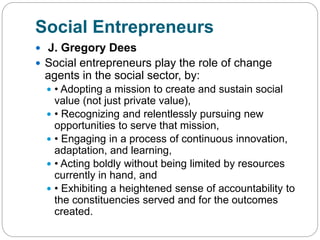 The document discusses key concepts around social entrepreneurship and social businesses. It defines social entrepreneurs as change agents who adopt a social mission to create social value, recognize opportunities to serve that mission, engage in continuous innovation and learning, act boldly without limitations of current resources, and maintain a high level of accountability. True social entrepreneurs will significantly reform or revolutionize their industries. Social businesses differ from traditional businesses in that their earned income strategies are tied directly to their social mission and they pursue a double bottom line of social and financial returns. The document also discusses differences between social entrepreneurs, non-profits, CSR programs, and provides examples of social business ideas and considerations for planning and human resources in social businesses.
