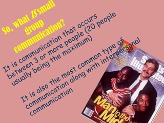 The document discusses the importance of small group communication, noting that it is essential for communicating with and organizing groups of individuals as well as focusing them on common goals. It is important for leaders like coaches, professors, parents, and military leaders. While small group communication is widely accepted, there are criticisms of some techniques used, but abilities like Skype have increased opportunities for such communication, especially in business. Good communication skills in small groups are important for success in many endeavors.