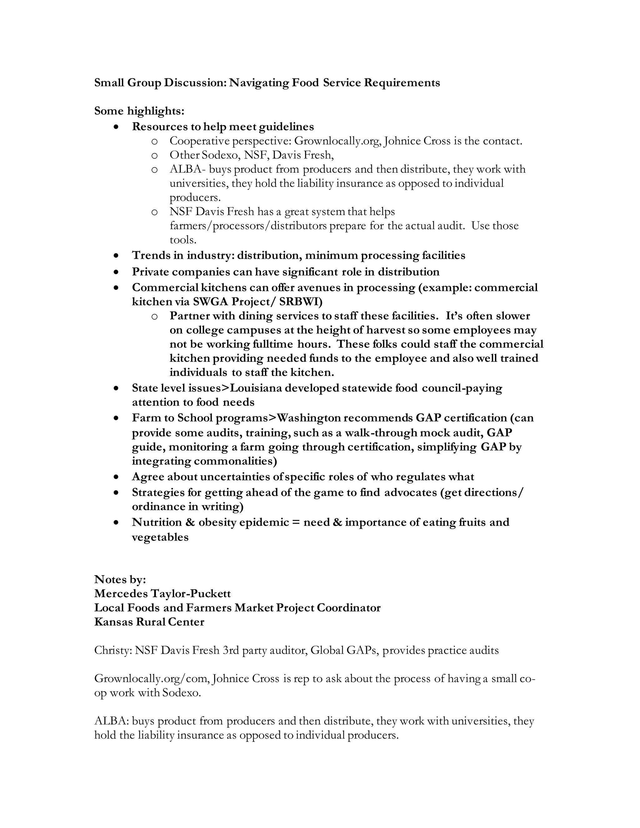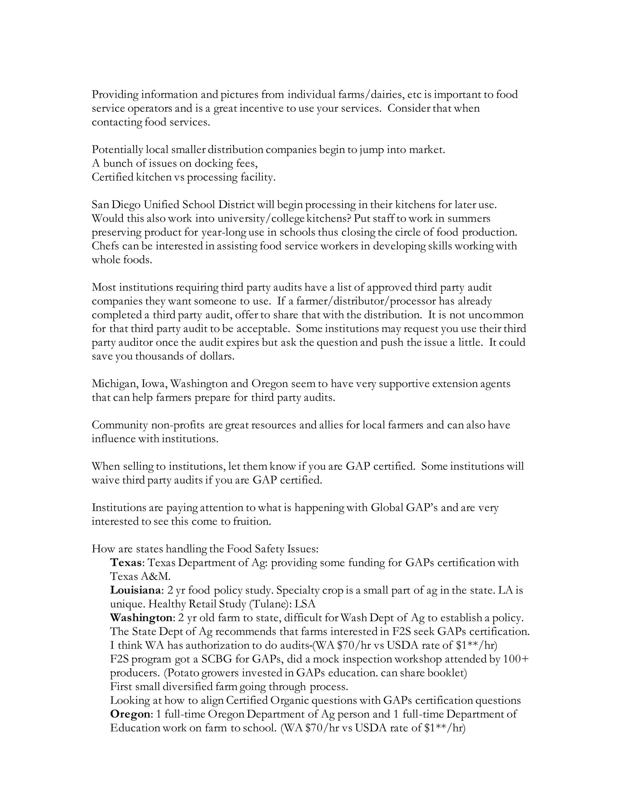 The document discusses strategies for small producers and cooperatives to navigate food service requirements and supply institutions. It provides resources for meeting guidelines like Grownlocally.org and ALBA, which buys from producers and distributes while holding liability insurance. Commercial and university kitchens can offer processing avenues. States like Washington provide GAP certification support and farm-to-school programs. Clarifying regulatory roles and obtaining direction in writing can help small producers get ahead in addressing food safety and access institutional markets.