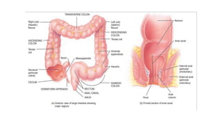 The small intestine functions to further digest and absorb nutrients from food. It is divided into three sections - the duodenum, jejunum, and ileum. The small intestine contains villi and microvilli that increase its surface area for absorption. Digestion and absorption continue in the small intestine through the actions of succus entericus and bile. The large intestine absorbs water and electrolytes from undigested material and forms feces from waste products.