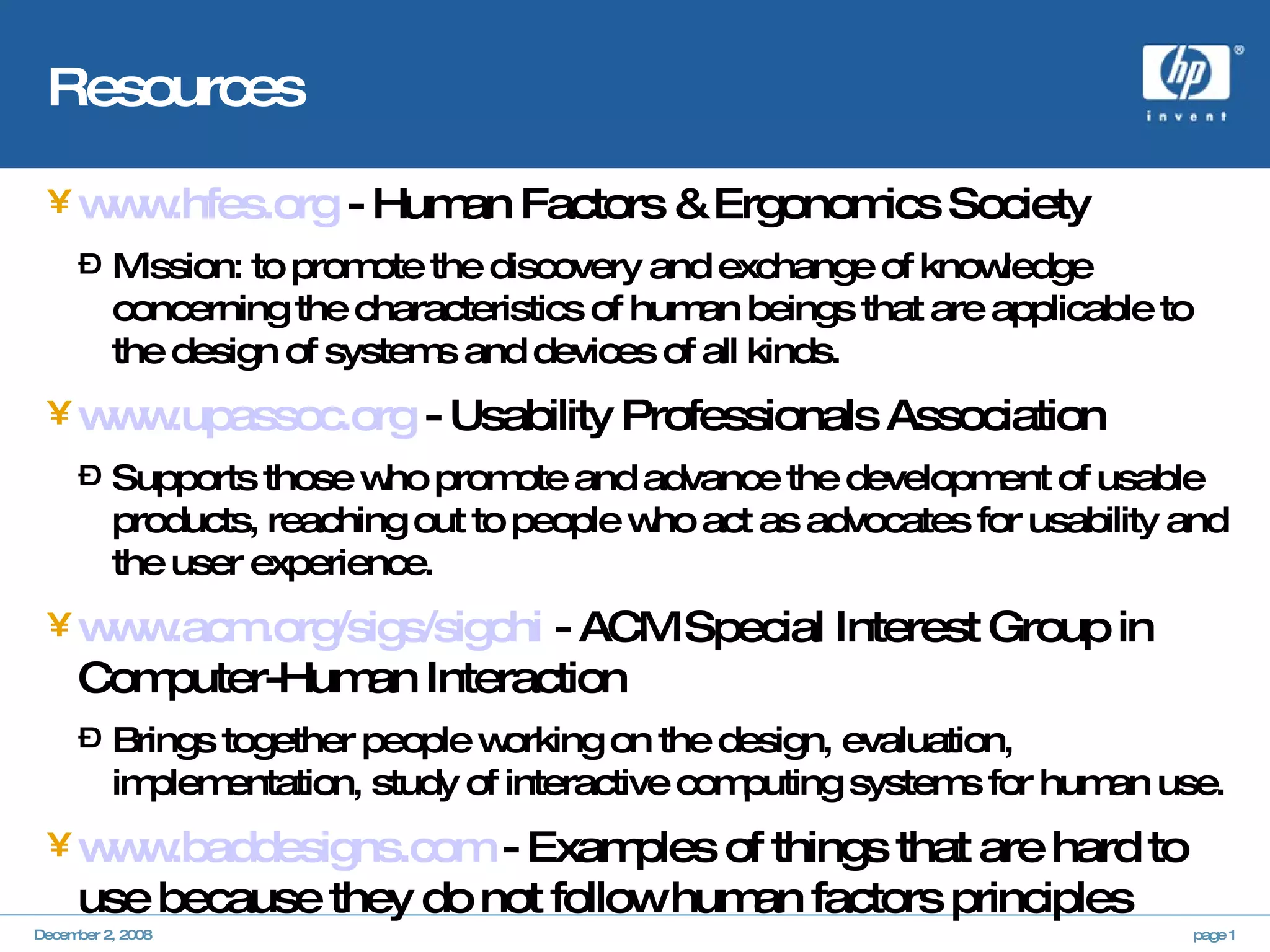 The document lists four websites related to human factors and ergonomics. The Human Factors & Ergonomics Society promotes applying human characteristics to system design. The Usability Professionals Association supports advocates for usable products and user experience. ACM SIGCHI brings together people designing human-computer interaction. Baddesigns.com shows examples of poorly designed things that ignore human factors principles.