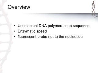 The document provides an overview of the next generation sequencing (NGS) single molecule real-time (SMRT) method, which utilizes DNA polymerase and fluorescent probes for sequencing. It outlines the step-by-step process, including the immobilization of DNA templates and polymerase, introduction of phospho-linked nucleotides, and detection of signals emitted during base incorporation. The method operates in parallel across thousands of zero-mode waveguide (ZMW) chambers to facilitate rapid sequencing.