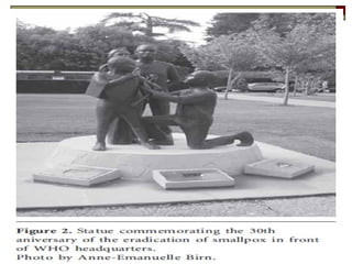 Smallpox is a contagious, disfiguring, and often deadly disease caused by the variola virus. There are two main forms of smallpox - variola major, which has a 30% fatality rate, and variola minor, which has a fatality rate below 1%. After incubation, smallpox progresses through several stages including prodrome, early rash, pustular rash, and scabs. It is most contagious during the early rash stage. Through global vaccination efforts beginning in the 1960s, the WHO declared smallpox eradicated worldwide in 1980. However, concerns remain about bioterrorism using the smallpox virus, which is classified as a