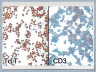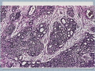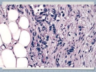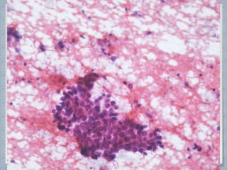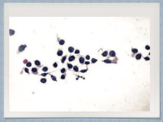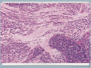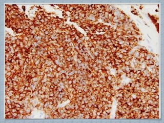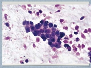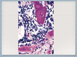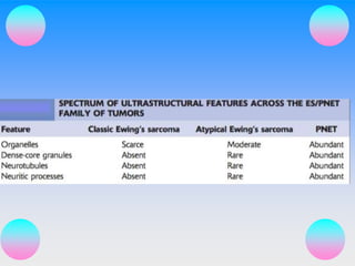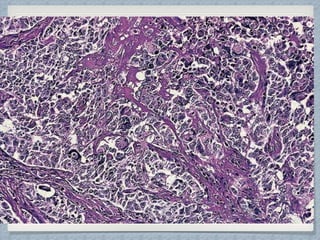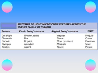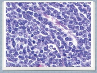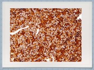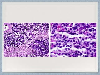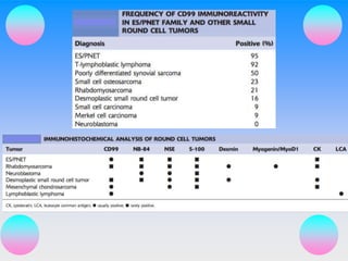 Small round cell tumors are a group of highly aggressive cancers composed of small, undifferentiated cells. The diagnostic approach involves clinical findings, imaging, pathology, and molecular genetics testing. Key small round cell tumors in pediatric patients include Ewing sarcoma, neuroblastoma, nephroblastoma, rhabdomyosarcoma, medulloblastoma, retinoblastoma, and lymphoblastic lymphoma. Immunohistochemistry and genetic testing are used to determine the specific tumor type to help guide treatment.