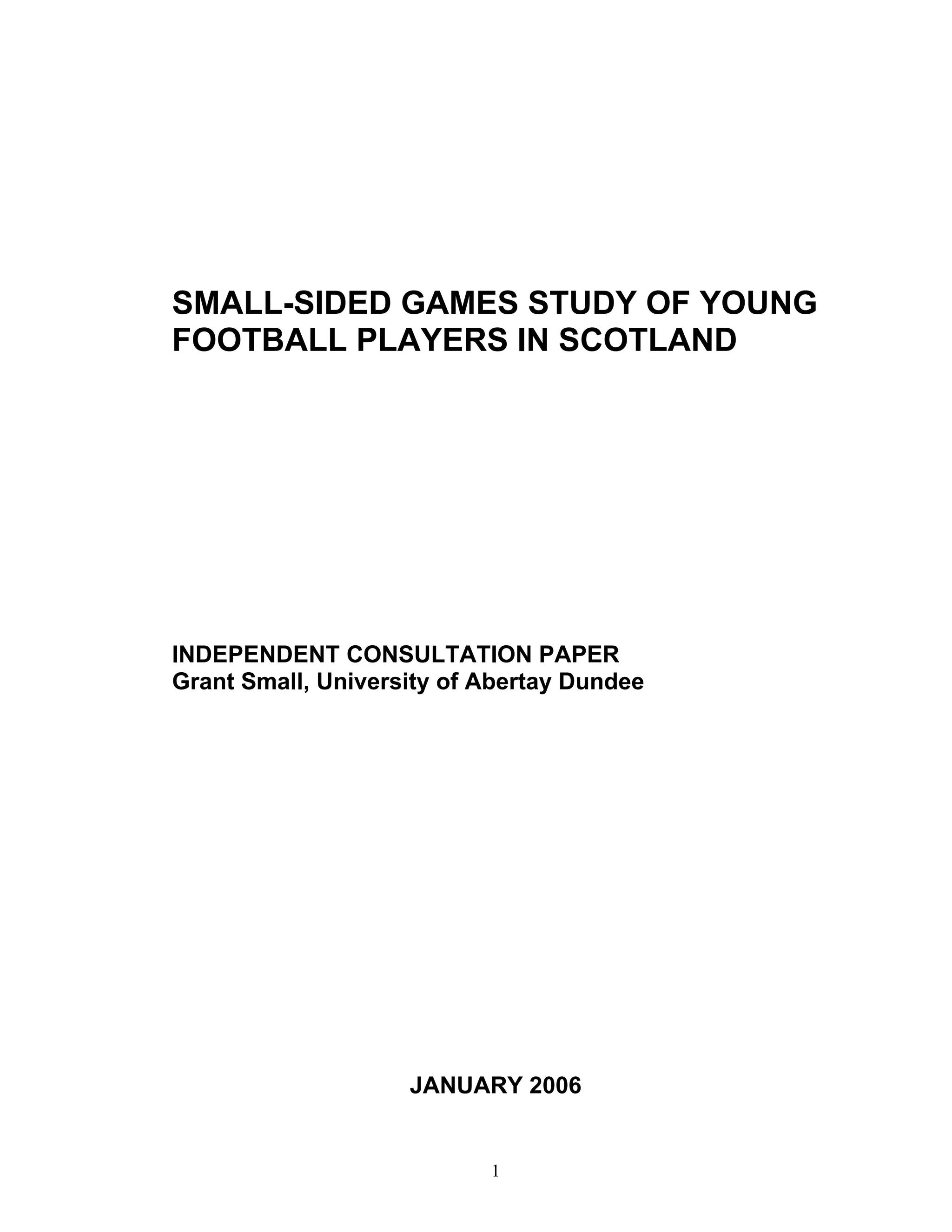 This study examined small-sided games for young Scottish football players using video analysis software. Researchers observed U12 players participating in 4v4, 7v7, and 11v11 games to collect data on their touches, passing, skills, and other metrics. Previous research found that small-sided games are better for developing youth players as 11v11 is too complex. The study aims to inform the debate on youth development and provide recommendations for future policy.