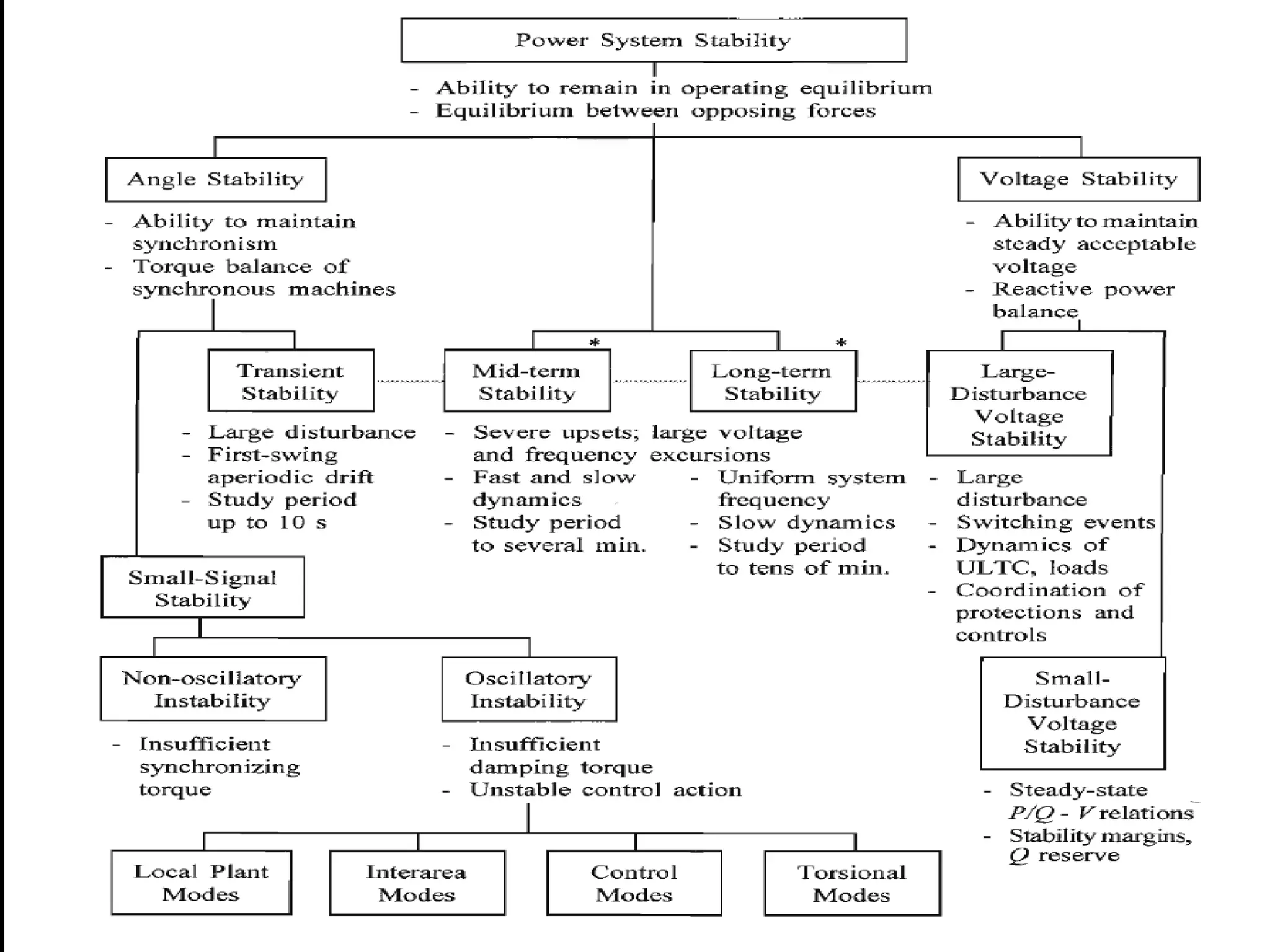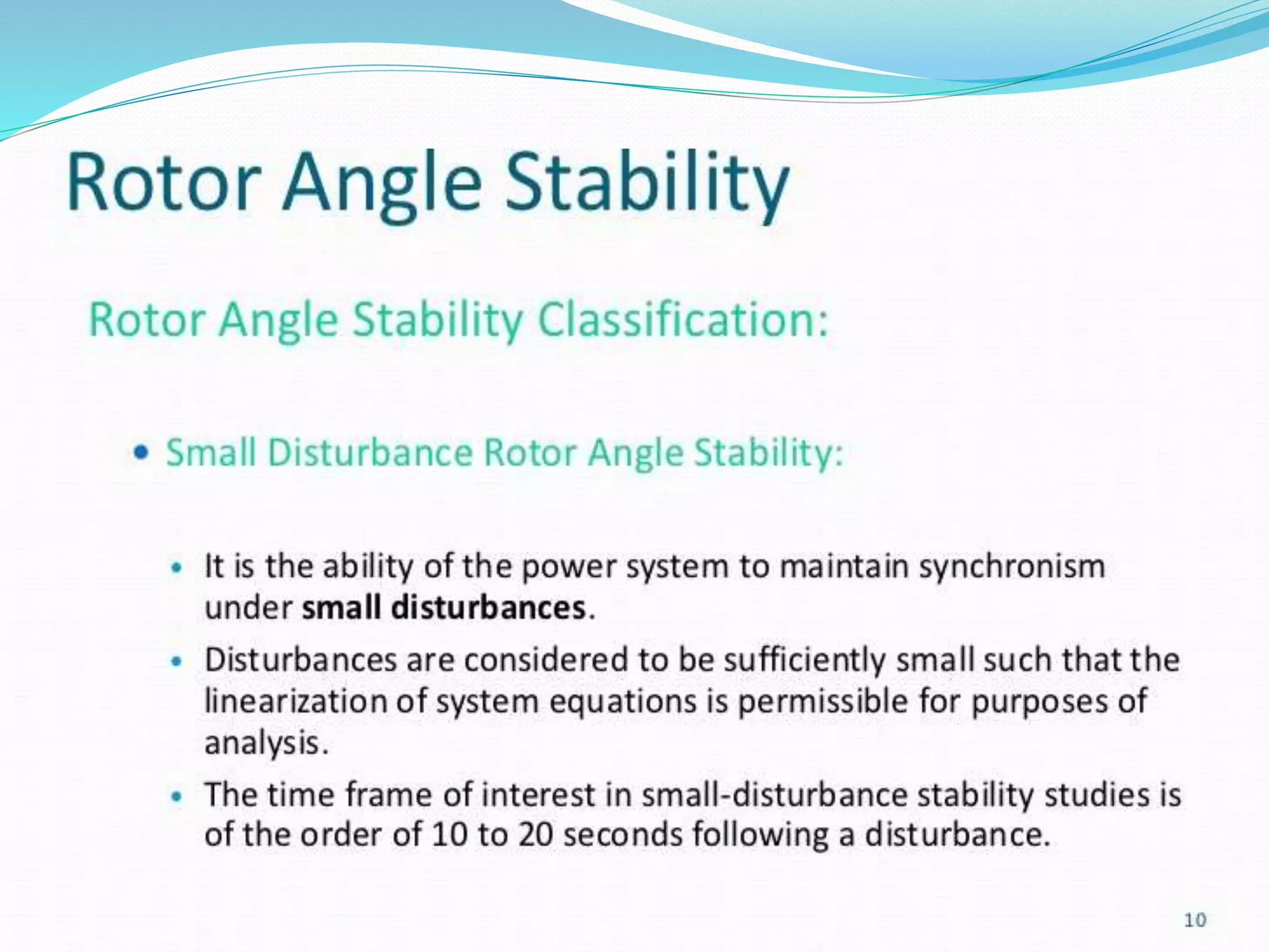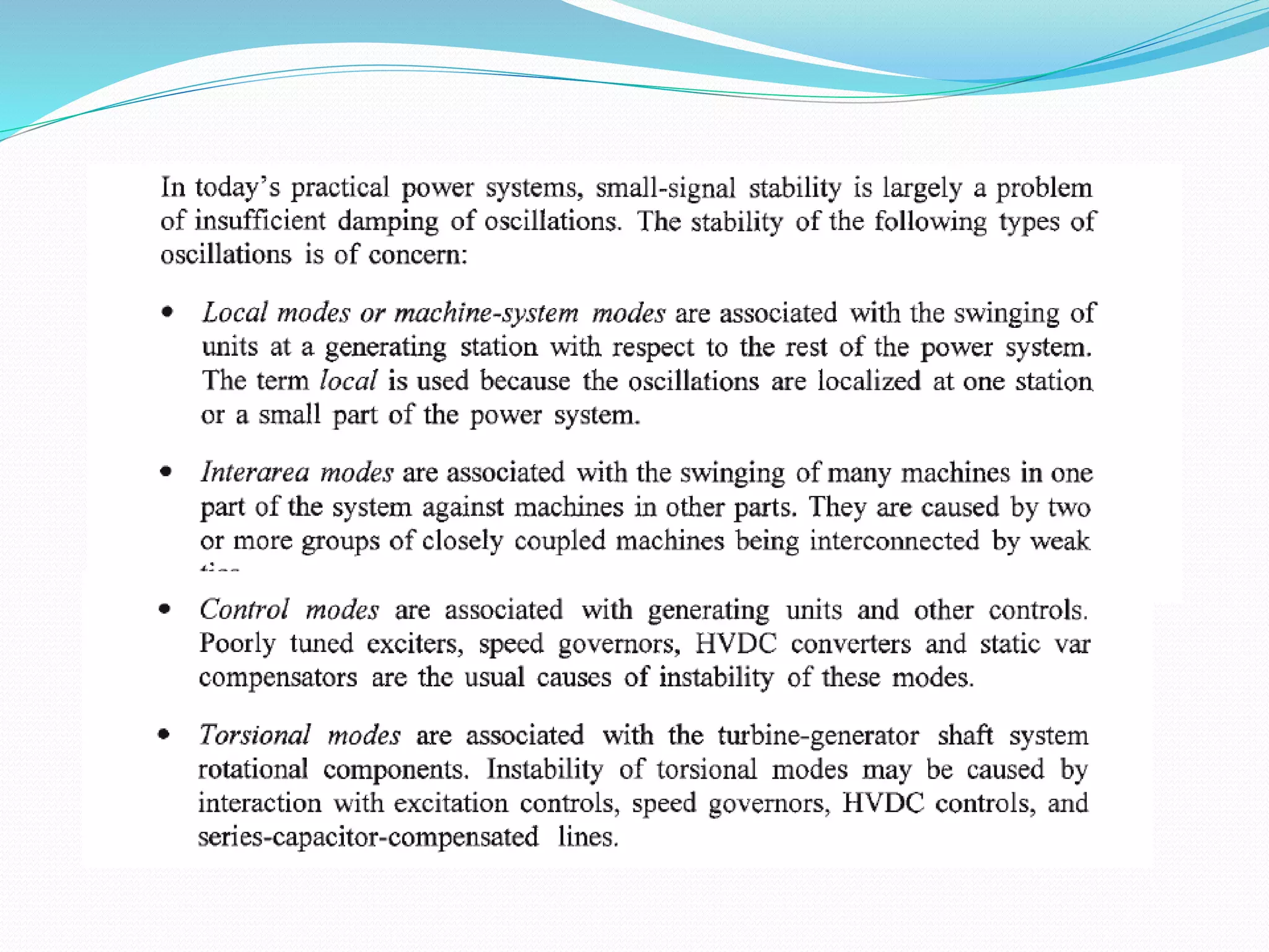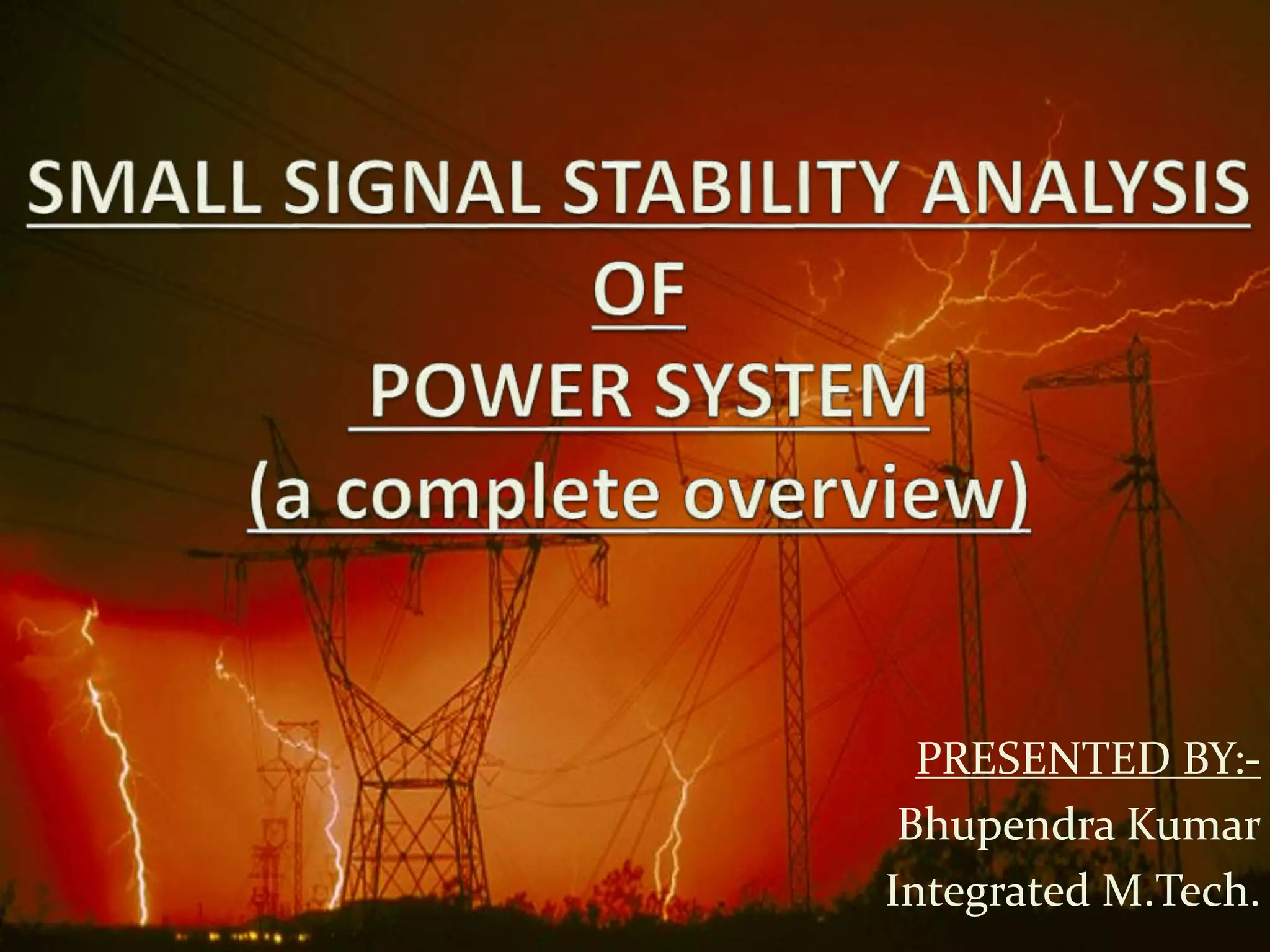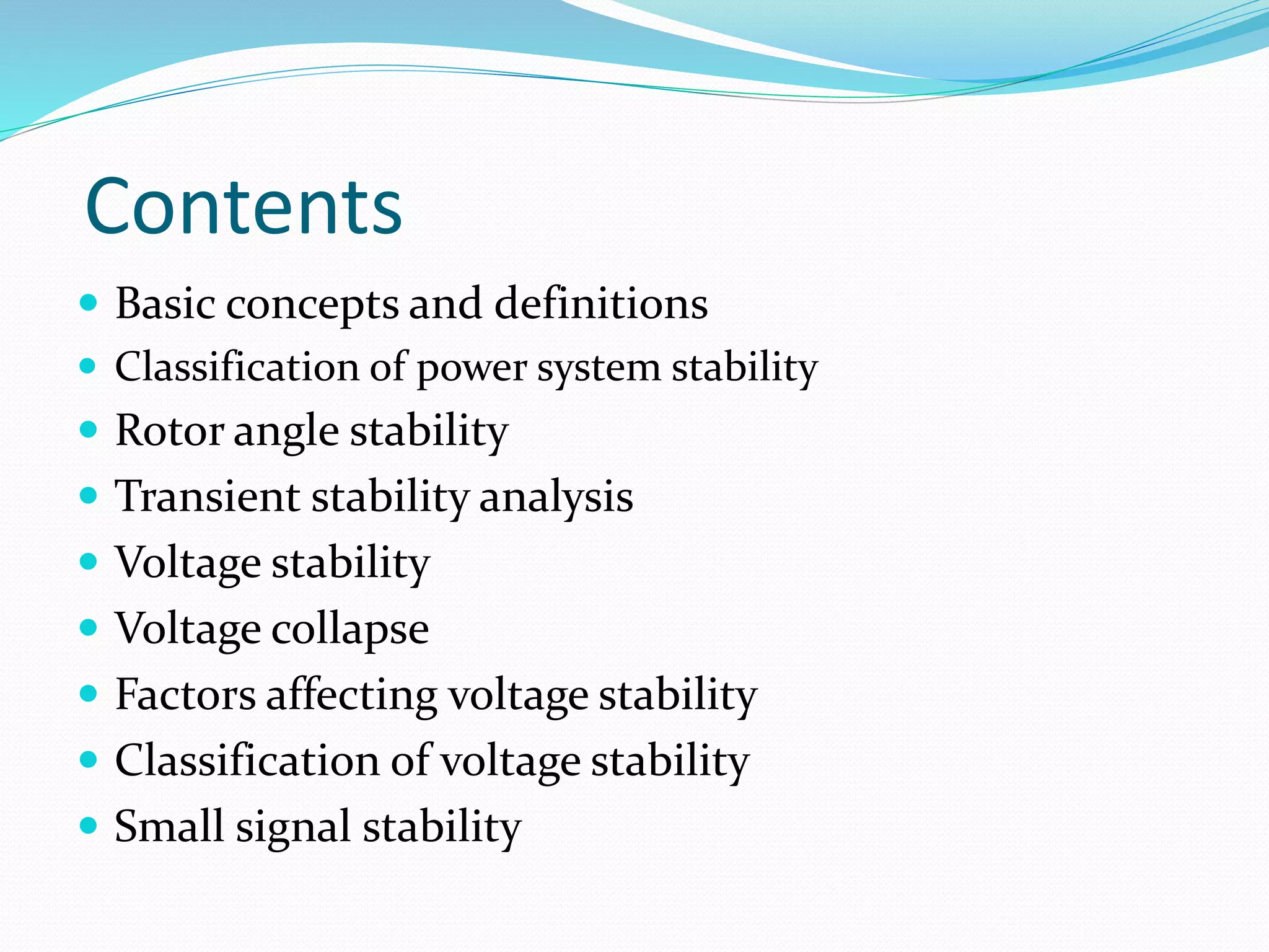 This document provides an overview of power system stability, including various types of stability issues like rotor angle stability, voltage stability, and small signal stability. It defines key concepts, classifies stability into different categories, and describes factors that affect stability issues like voltage stability. Analysis techniques for different stability problems are discussed, like transient stability analysis, PV curves for voltage stability assessment, and eigenvalue analysis for small signal stability. The role of controls like power system stabilizers is also mentioned.