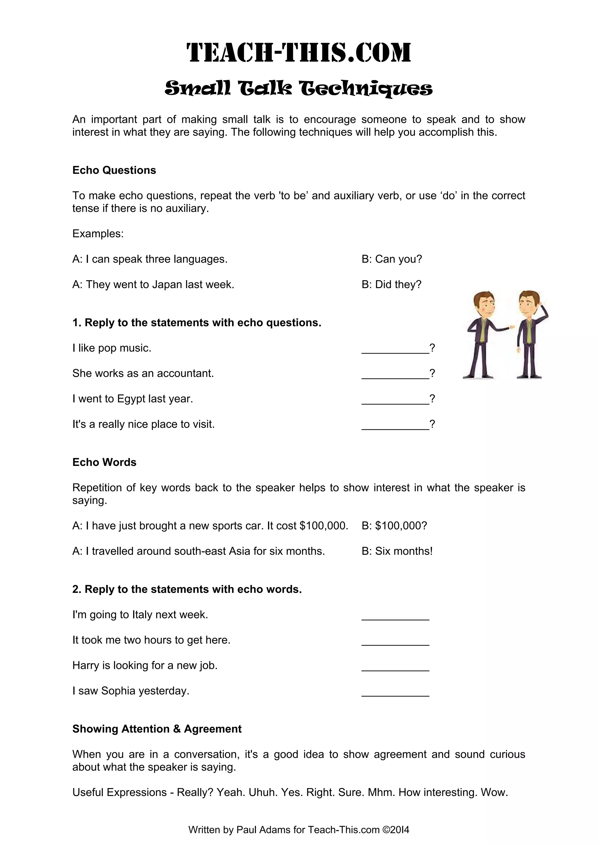 The document provides techniques for making small talk, including using echo questions that repeat parts of what the other person said, echo words that repeat key words, showing attention through expressions like "really" and "wow", and asking follow-up questions with "wh-" words. It includes examples of mini-dialogues that demonstrate these techniques and exercises for students to practice them, such as taking turns asking questions on topics and keeping a conversation going.