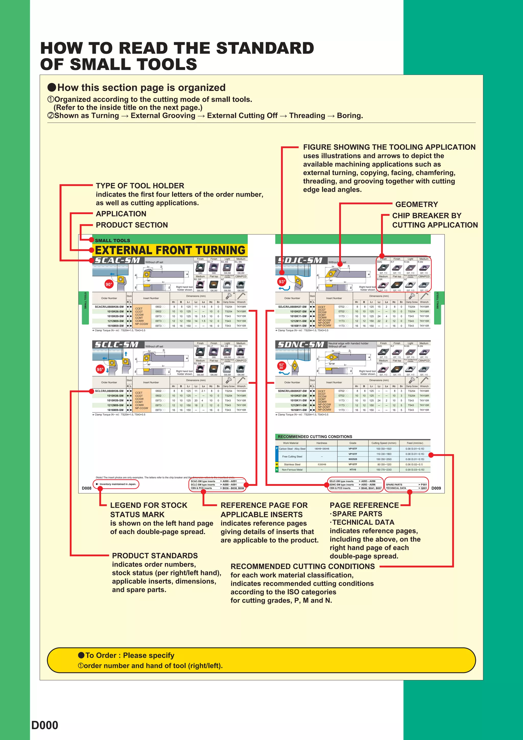 This document provides information on small tools for gang type automatic lathes. It is organized by cutting application, including external turning, back turning, grooving, cutting off, and boring. For each application it provides details on the tool type, insert geometry such as cutting edge width and overhang, and features such as breaker inserts and minus tolerance corners for small parts machining. Recommended cutting conditions are also provided for various work materials.