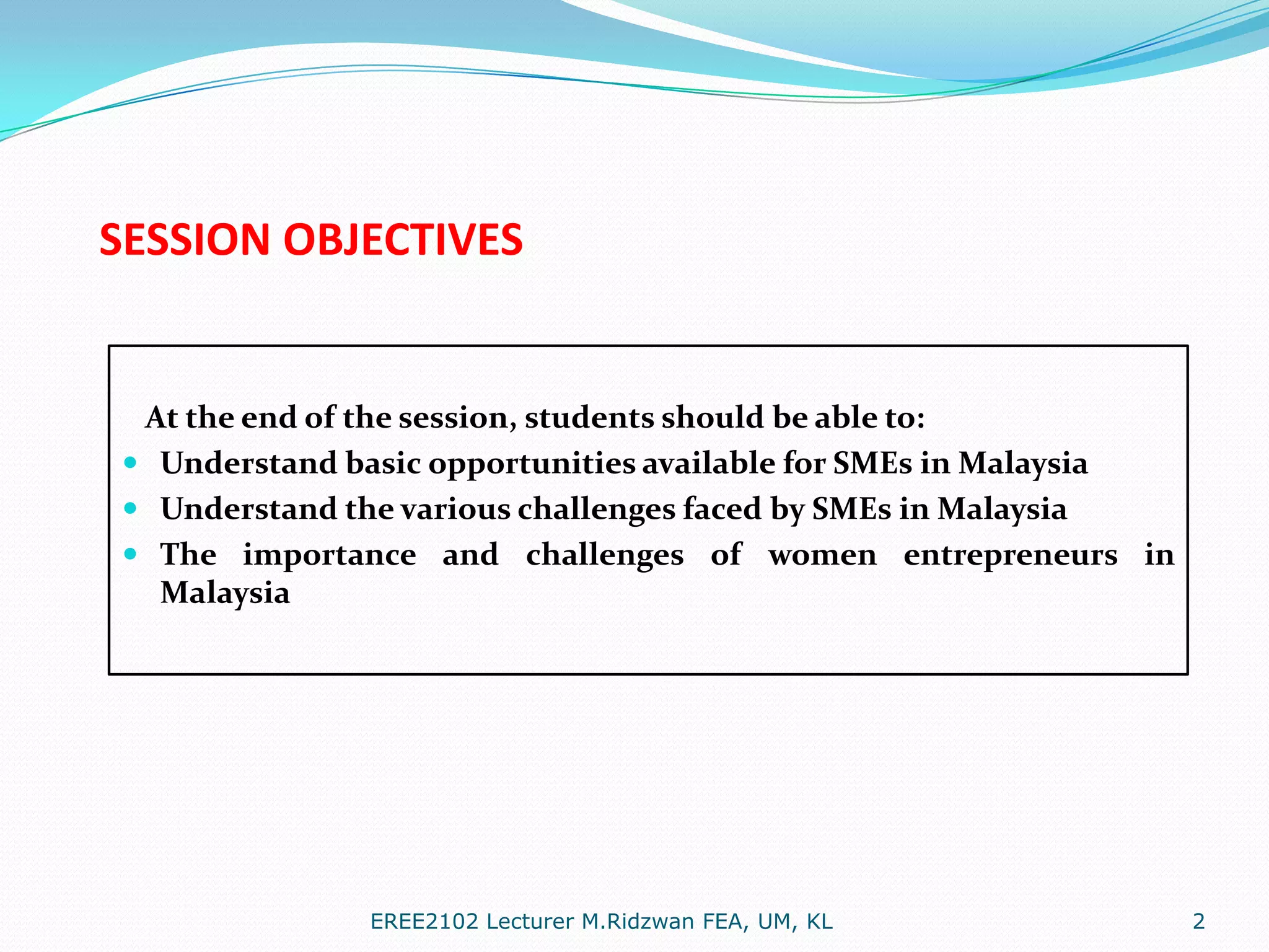This document discusses opportunities and challenges for small and medium enterprises (SMEs) in Malaysia. It begins by outlining the session objectives which are to understand basic opportunities for SMEs, challenges they face, and the importance and challenges of women entrepreneurs. It then details various opportunities available to SMEs through government programs and policies as well as private sector initiatives. These include financial assistance, research and development support, and trade promotion. However, SMEs also face challenges such as access to funding, lack of research and development, underutilization of technology, labor shortages, lack of branding, and limited access to domestic and international markets. Overcoming these challenges requires efforts from both the government and SMEs.