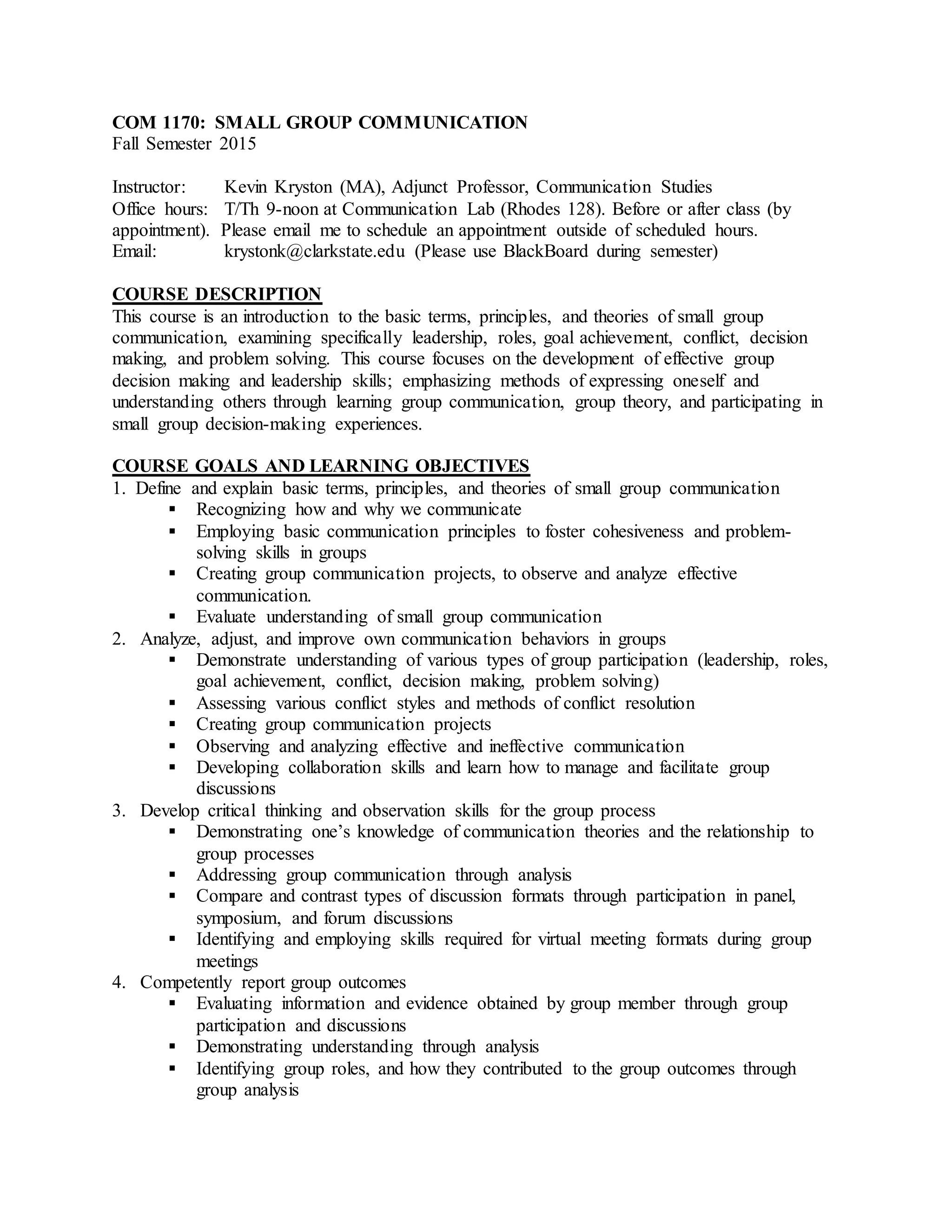 This document provides information about a small group communication course being offered in the fall semester of 2015. It includes details about the instructor, course description and goals, assignments, grading structure, and class schedule. The main goals of the course are to define small group communication principles and theories, analyze and improve communication behaviors in groups, develop critical thinking skills for group processes, competently report group outcomes, and select and evaluate source materials for group presentations. Graded assignments include group reports, individual papers, quizzes, a group project, and a final exam. Students will participate in small group activities and discussions throughout the semester.
