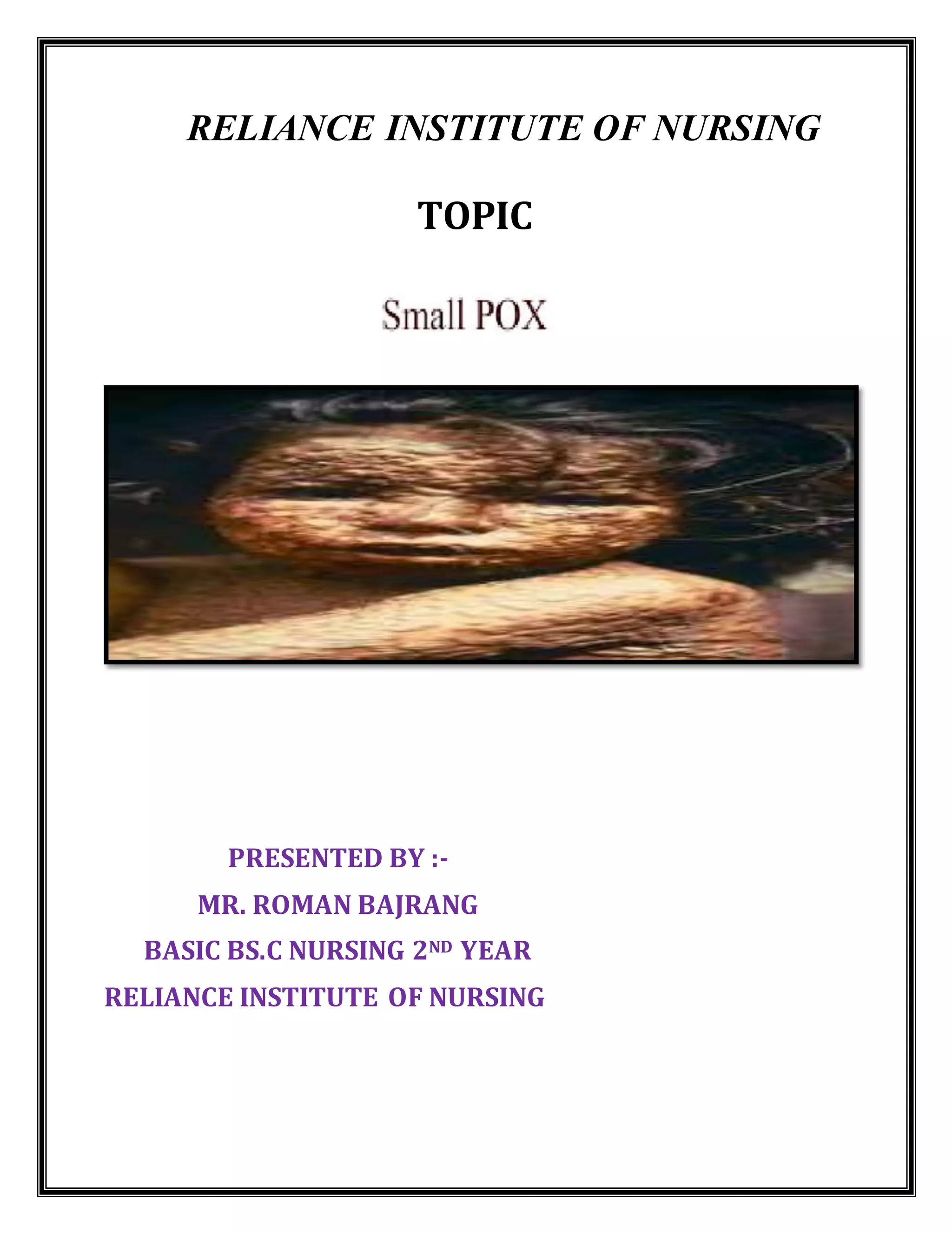 This document provides an overview of smallpox, including its history, microbiology, types, transmission, symptoms, treatment and vaccination. Smallpox is a highly contagious viral disease that was responsible for 300-500 million deaths in the 20th century. It first appeared in northeast Africa around 10,000 BC and was a major killer worldwide until the successful vaccination program led by Edward Jenner in the late 18th century. Jenner demonstrated that inoculating humans with cowpox conferred immunity to smallpox. The smallpox virus belongs to the orthopoxvirus family and causes a characteristic rash and pustules on the skin. Transmission occurs via airborne droplets from the respiratory tract. There is