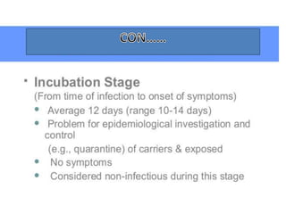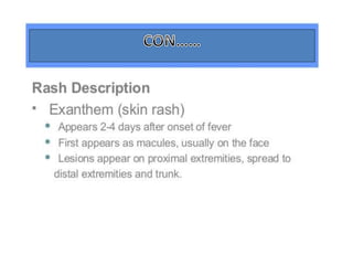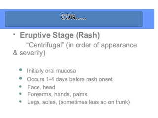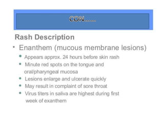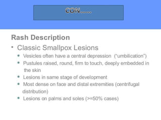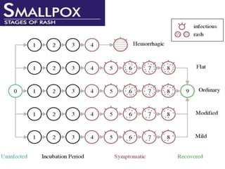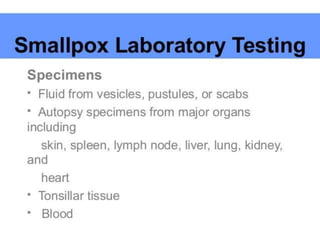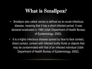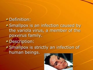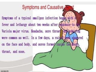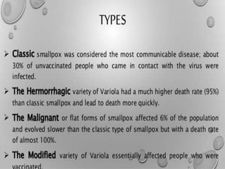 Variola virus causes the acute, contagious disease smallpox. It was effectively eradicated through global vaccination efforts led by the WHO between 1966-1979. Smallpox is characterized by an initial fever and flu-like symptoms followed by a distinctive pustular rash. It spreads through respiratory droplets or direct contact with infected individuals or contaminated objects. Vaccination provided effective immunity and was a major factor in eliminating smallpox worldwide by 1980, making it the only human infectious disease to be fully eradicated.