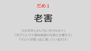 老害 「t小文字とかいちいちウルサイ」 「オブジェクト指向言語の元祖とか偉そう」 「ジジイが思い出に浸っているだけ」 だめ1