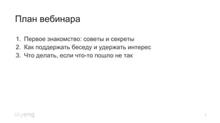 Вебинар на тему 'маленьких бесед' пройдет 11 мая и охватит советы по знакомству, поддержанию разговора и решению проблем в общении. Участникам предложат примеры фраз, хороших и неудачных тем для разговоров, а также рекомендации по взаимодействию в международной среде. Также будет информация о возможностях обучения в онлайн-школе Skyeng.