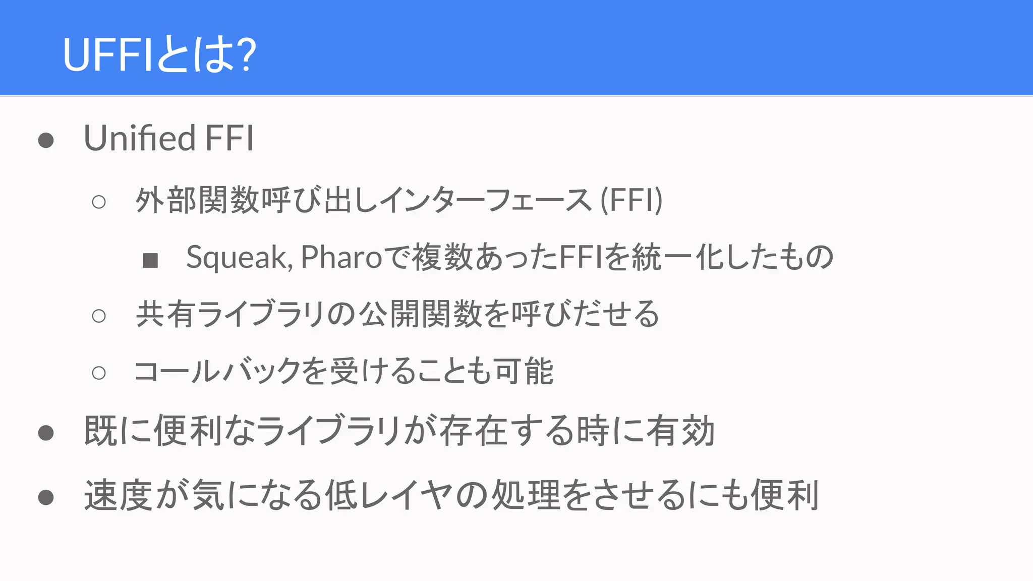 外部関数呼び出しインターフェース (FFI) ■ Squeak, Pharoで複数あったFFIを統一化したもの ○ 共有ライブラリの公開関数を呼びだせる ○ コールバックを受けることも可能 ● 既に便利なライブラリが存在する時に有効 ● 速度が気になる低レイヤの処理をさせるにも便利