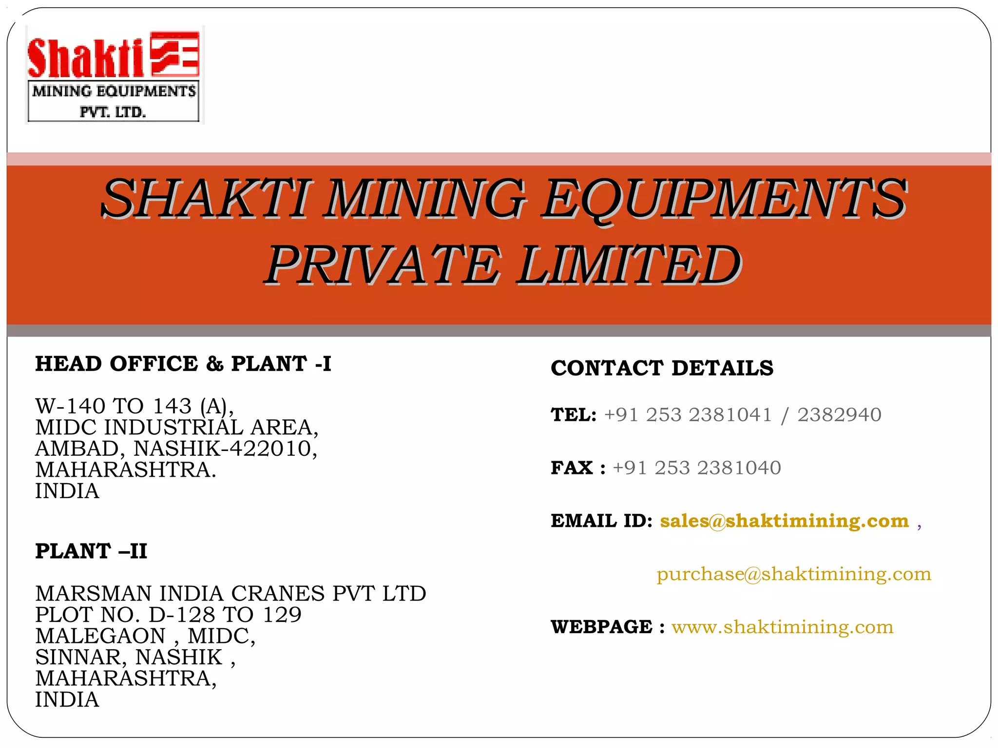 Shakti Mining Equipments Pvt. Ltd, founded in 1986 and based in Nashik, Maharashtra, is a leader in crushing technology, producing a range of crushers and allied equipment for construction and mining industries. The company emphasizes quality, modernization, and customer satisfaction while providing durable machinery designed using advanced technology. Their product offerings include various types of crushers, screens, and complete crushing plants, backed by a commitment to service and support.