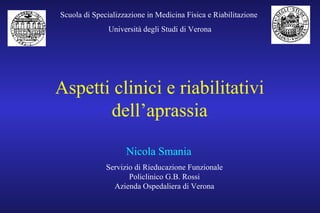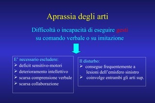 Il documento discute l'aprassia, un disturbo neurologico che colpisce la capacità di eseguire movimenti e gesti, definendo diverse categorie come aprassia ideativa e ideomotoria. Viene esaminata l'epidemiologia, la valutazione e i risultati di trattamenti riabilitativi specifici, evidenziando miglioramenti nei pazienti con formazione mirata. Infine, si approfondiscono gli approcci riabilitativi e le relazioni tra aprassia e disabilità nel contesto delle attività quotidiane.