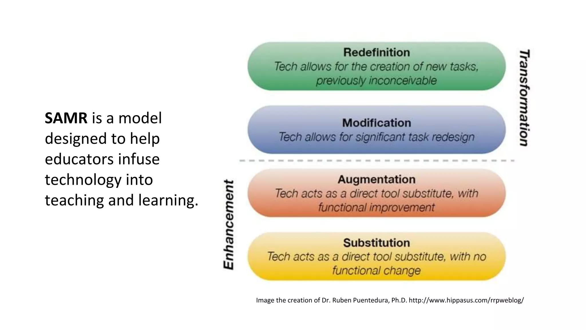 This document discusses models for integrating technology into teaching and learning: SAMR and TPACK.
