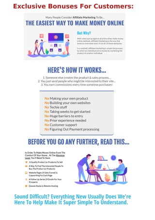 The document introduces affiliate marketing as a viable way to earn income online by selling products on behalf of others and earning commissions. It provides a step-by-step guide on how to get started, including finding niches, promoting products, and reaching success while avoiding common mistakes. The document emphasizes the flexibility, low startup costs, and potential for high earnings in affiliate marketing.