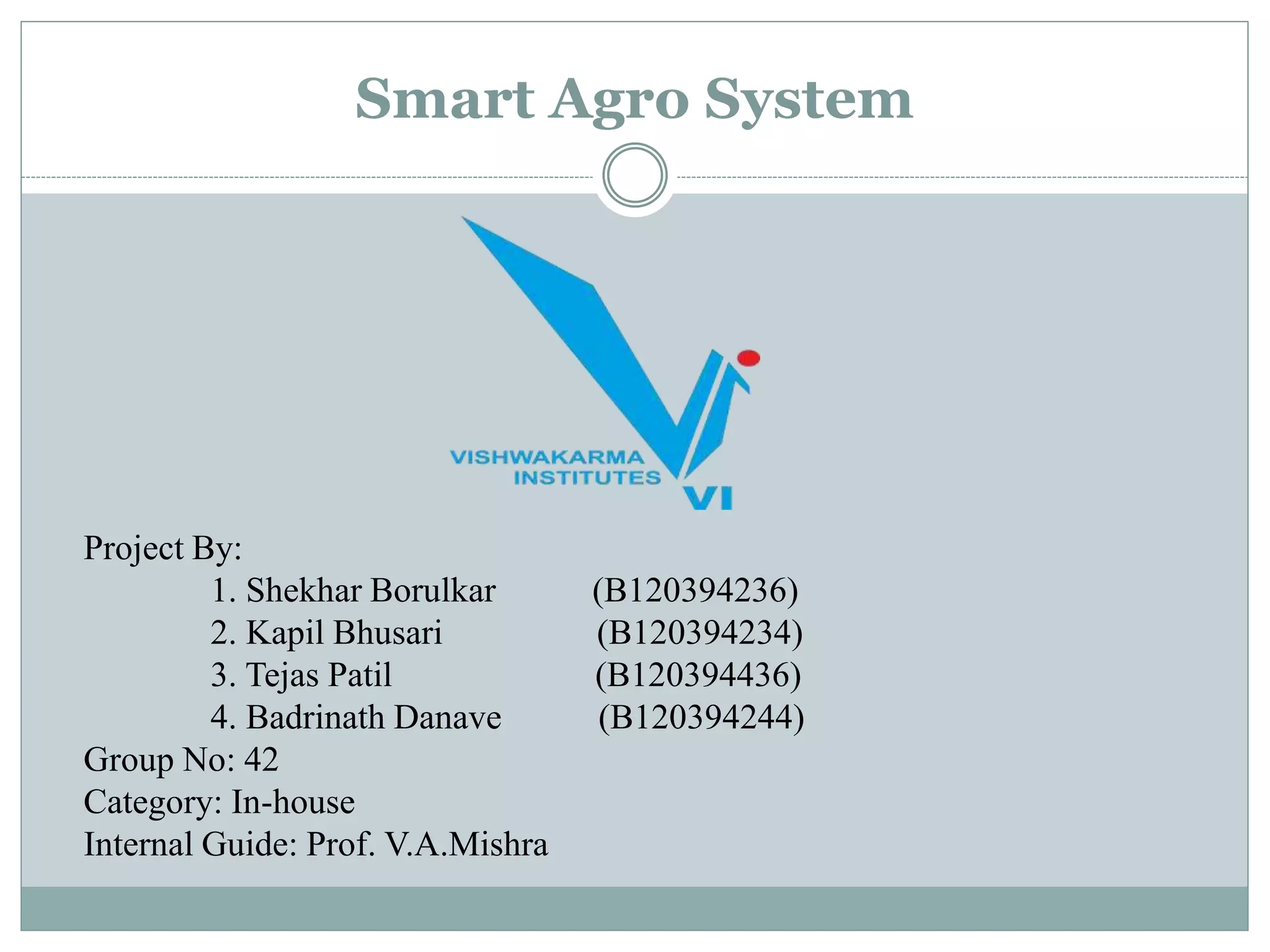 This document describes a smart agro system project created by four students. The system uses a wireless sensor network and sensors to monitor soil properties like moisture, temperature, humidity, and pH levels. It provides farmers recommendations on fertilizer use and irrigation. The objectives are to create an effective, low-cost, user-friendly decision support system. It will help farmers reduce waste, increase yields, and improve their lives. The system hardware uses an Arduino platform and sensors. The software includes an Android app and database. Future work includes cloud storage and adding animal monitoring sensors. The conclusion is that the system will help farmers monitor fields and activities to boost production through efficient water and input use.