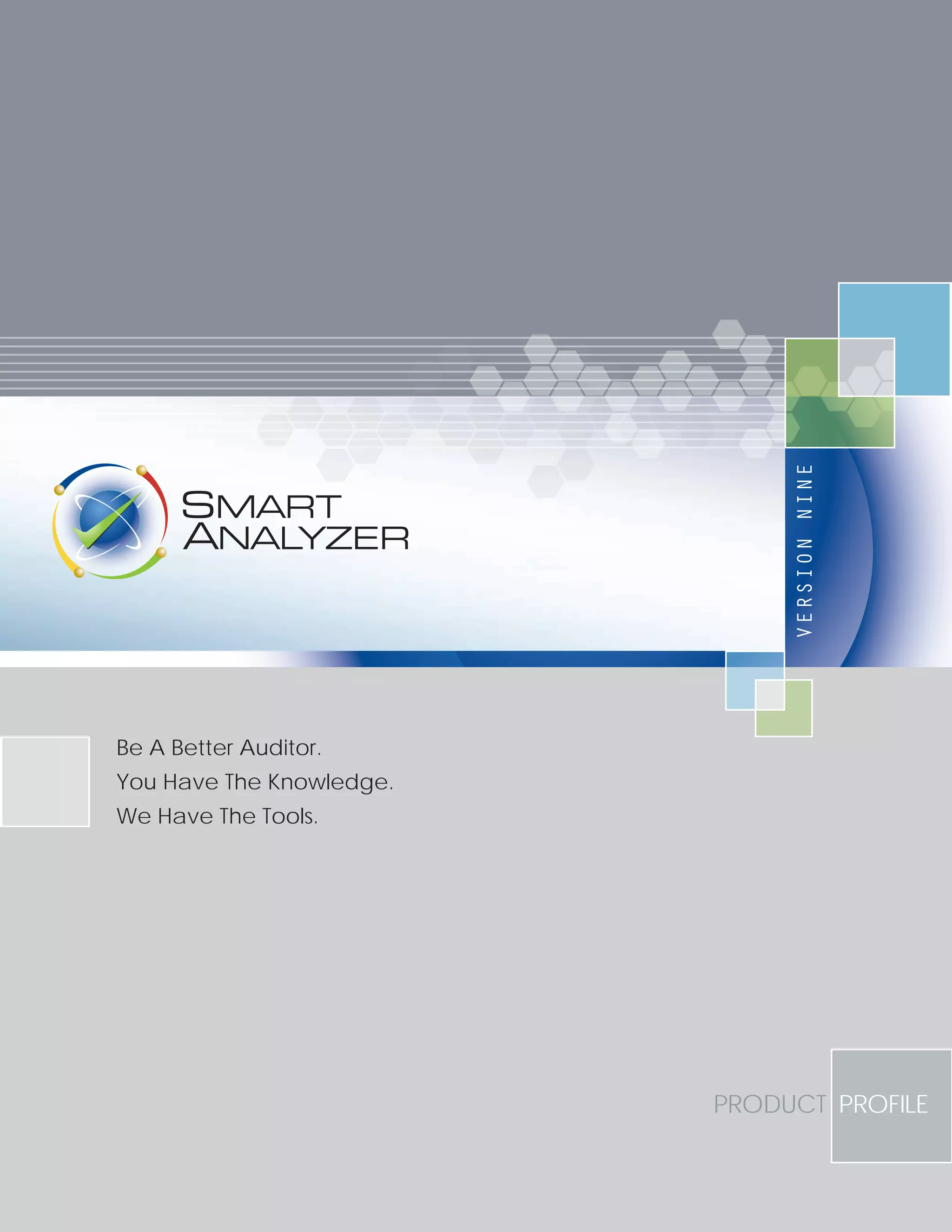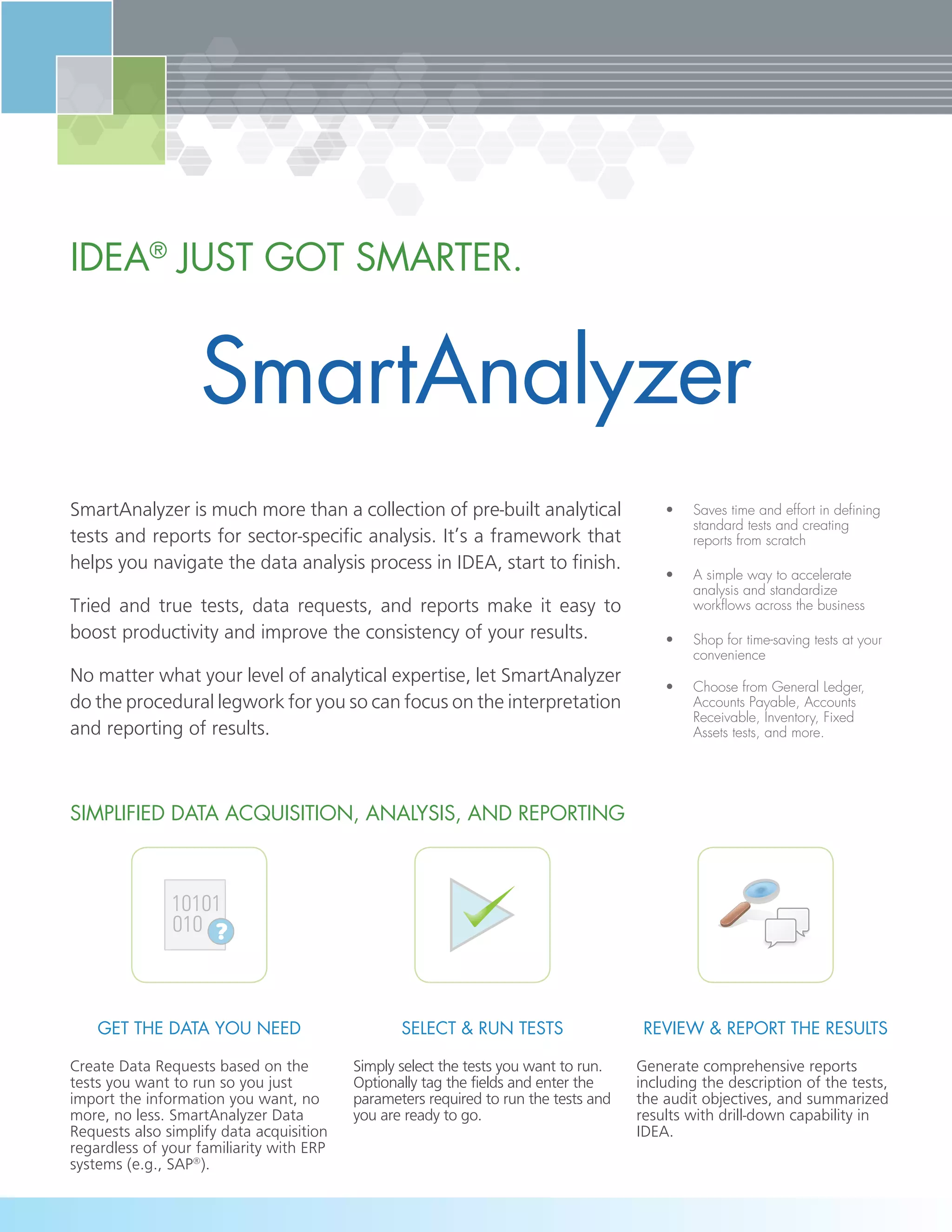 SmartAnalyzer is an audit software tool that provides predefined tests, templates, and reports to simplify the audit process. It streamlines data acquisition, analysis, and reporting. SmartAnalyzer includes tests for general ledger, accounts payable, accounts receivable, inventory, and fixed assets. Users can purchase additional tests and apps from the SmartAnalyzer Marketplace. The software integrates with IDEA audit software to allow users to select tests, run analyses, and generate reports all within the IDEA interface.