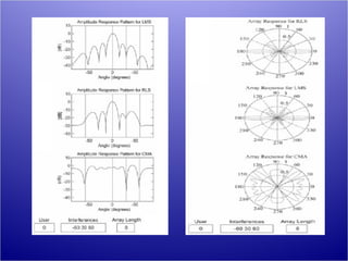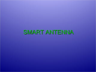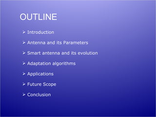 Smart antennas are antenna arrays that use digital signal processing to optimize performance by steering beams towards desired signals and nulling interference. They can enhance capacity, coverage, transmission efficiency and interference rejection for applications in military communications, satellite communications, mobile communications, wireless sensor networks, and terrestrial television reception. Future applications include 5G networks with data rates over 10 Gbps using multiple smart antennas in mobile devices. Smart antennas represent a promising technology for resolving traffic capacity issues in future broadband wireless networks.