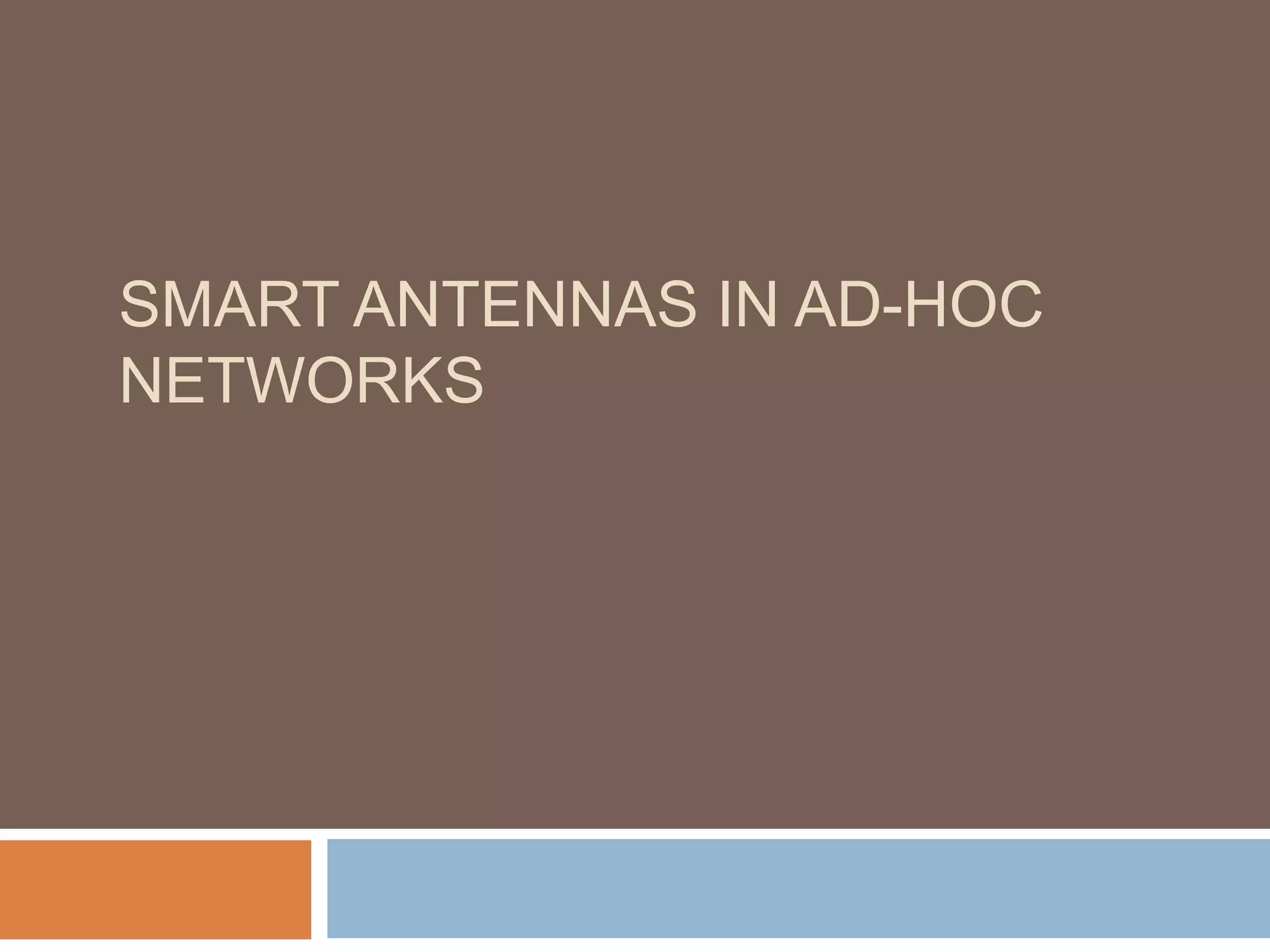 Smart antennas can help overcome problems in ad-hoc networks by increasing efficiency. Using a two-lobe antenna pattern addresses hidden terminal problems from nodes not receiving RTS/CTS frames by keeping them silent. It also uses an additional antenna lobe to cover potential interference in opposite directions. For asymmetry in gain issues, increasing antenna gain ensures nodes in forbidden zones can receive RTS/CTS frames. The paper concludes smart antennas can enhance ad-hoc network performance by providing a greater combined gain than individual techniques.
