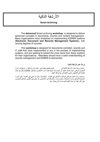The advanced smart archiving workshop focuses on advanced concepts in documents, records, and content management, targeting document controllers, records, and IT staff involved in implementing electronic document and records management systems (EDRMS). The course aims to provide attendees with essential knowledge on EDRMS and Enterprise Content Management (ECM), helping organizations extract greater value from their systems. Key objectives include understanding policy frameworks, developing business cases for implementation, and establishing plans for digital preservation.