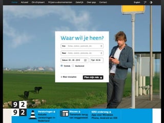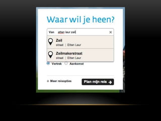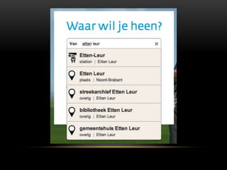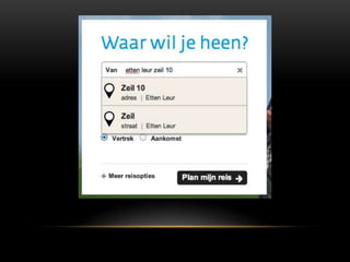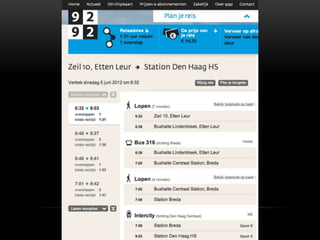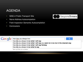 The document discusses the development of the 9292.nl public transport site, highlighting its capabilities to handle 1 million travel advices daily and the integration of a semantic autocompletion system. It details challenges with data ambiguity and the iterative tuning process using real user inputs to improve search quality and speed. The conclusions note positive feedback and the effectiveness of the implemented solutions while recognizing that a simpler approach may suffice in some cases.