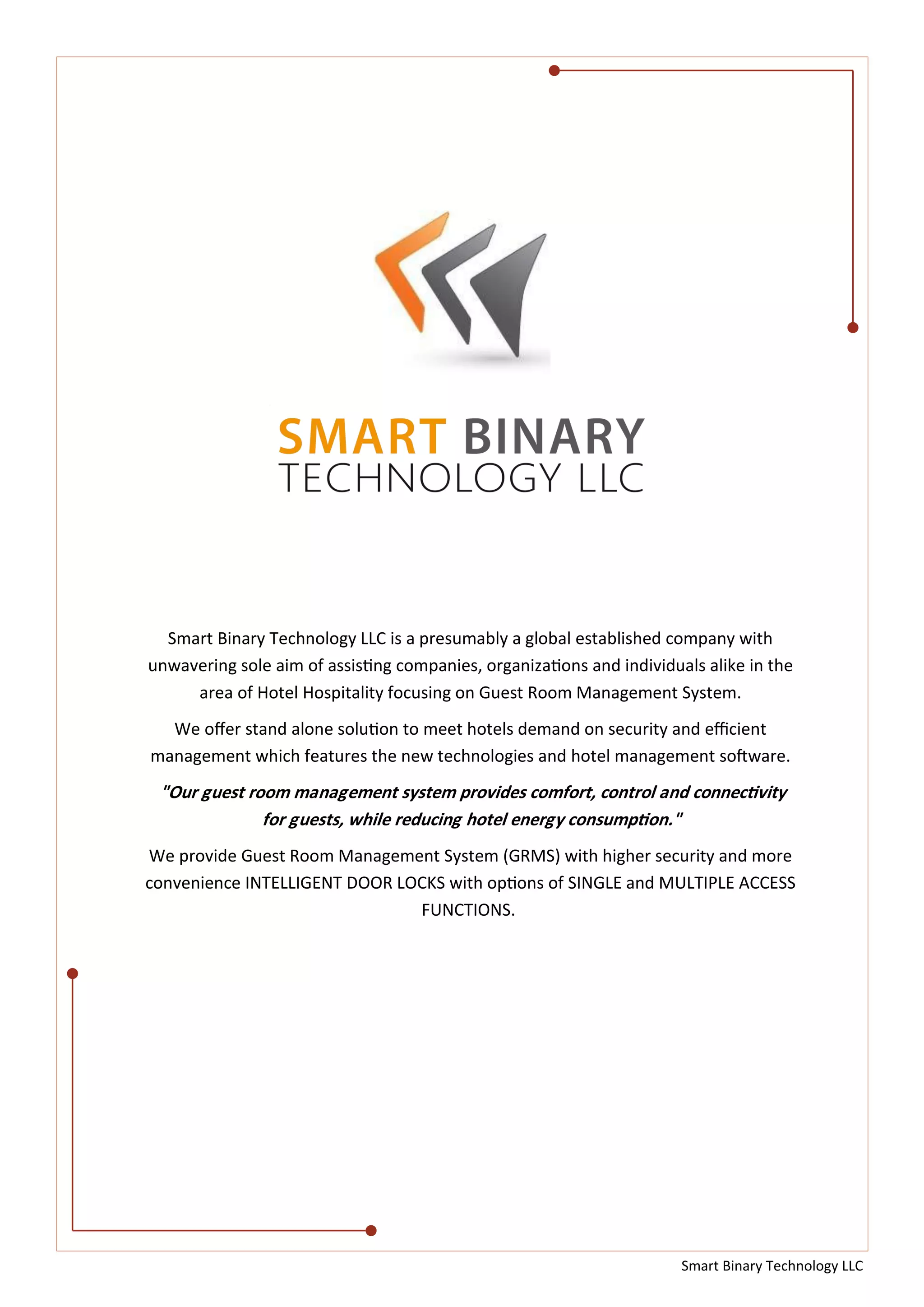 Smart Binary Technology LLC is a global company that provides guest room management systems and other hotel hospitality solutions. It offers a standalone guest room management system featuring new technologies and hotel management software to meet hotels' demands for security and efficient management. The system provides comfort, control, and connectivity for guests while reducing energy consumption. It also provides intelligent door locks with single or multiple access functions.