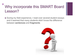 This document proposes using a SMART Board lesson to teach students the difference between sentences and fragments. It notes that many students struggled with this in essays. A SMART Board lesson would be more interactive than traditional methods like worksheets. The lesson would involve students dragging example sentences and fragments to bags labeled "Sentence" and "Fragment" on the SMART Board. The class would then discuss why each choice was right or wrong, and how to fix fragments. The interactive nature of this lesson keeps students engaged and allows them to participate directly.