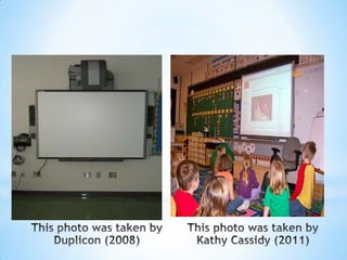 SMARTBoards are interactive whiteboards used by 40 million students worldwide and in the United States. They have computer functions, special ink pens, projectors, educational programs, and content-rich stimulants. Upgrade options are also available.
