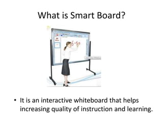 Smart Boards are interactive whiteboards that help increase the quality of instruction and learning by engaging students with different learning styles. They deliver curriculum in a more interactive and interesting way through their touch-sensitive surface and smart pen tray. Teachers can use them to provide hands-on activities and surveys to better engage students.