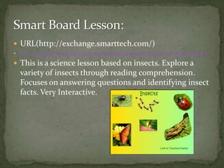 This science lesson introduces students to various insects through reading comprehension exercises, videos, and group discussion. The lesson focuses on six insects and has students answer questions about each one. It also allows students to research additional insect-related questions in small groups. The lesson is designed for grades 4-5 and utilizes the Smart Board for interactive elements while supporting multi-language learners.