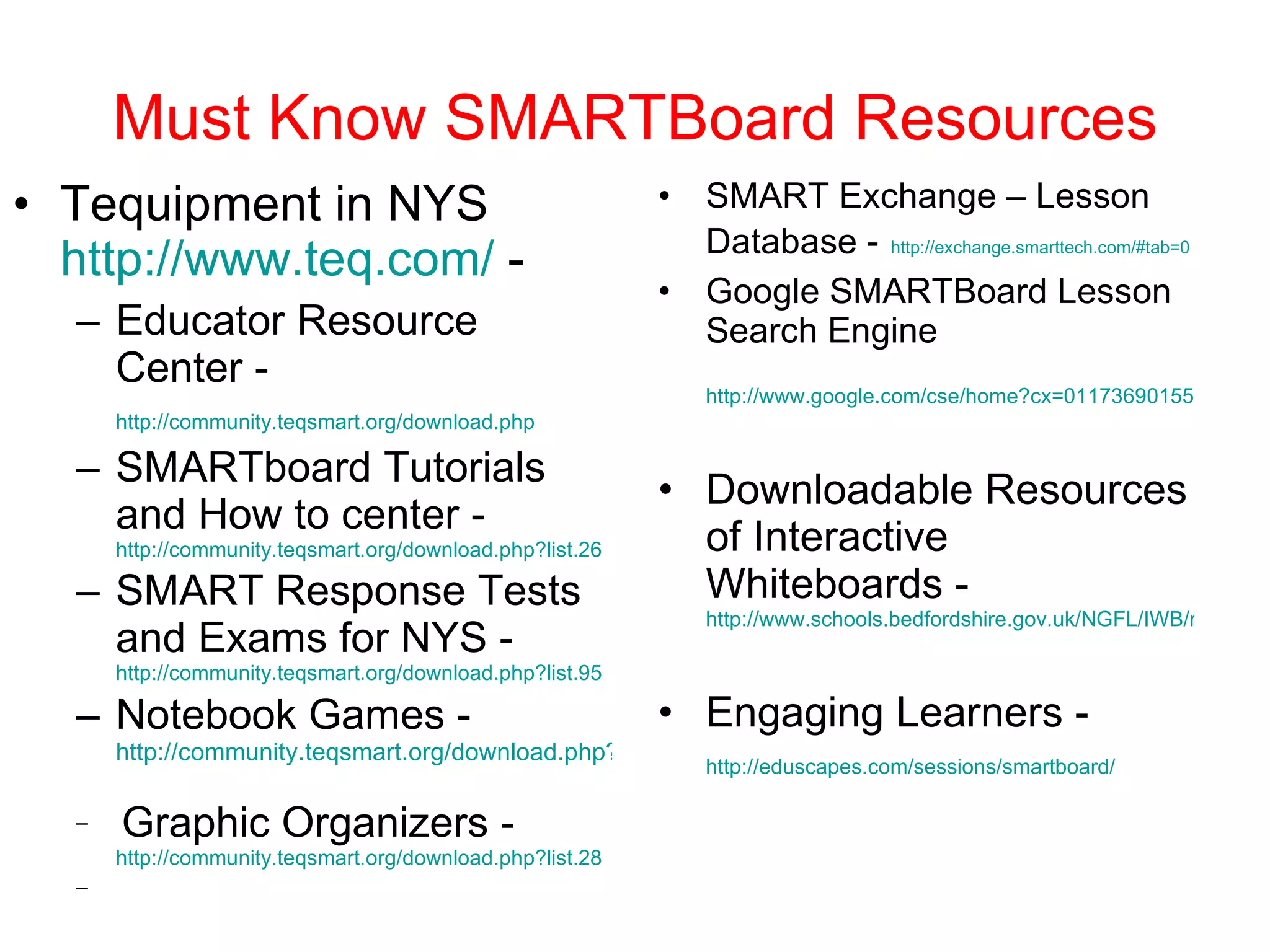 1. The document provides a list of resources for using SMARTBoards and other interactive classroom technology in New York schools.