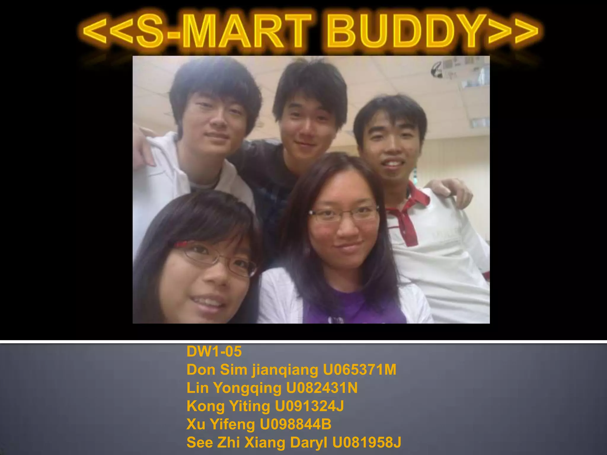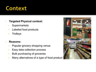 This document proposes the S-MArT Buddy, a technology that attaches a LCD device and handheld scanner to supermarket trolleys. The scanner provides food content information for each item scanned to help users make healthier choices and raise awareness of unhealthy eating trends that can lead to issues like colon cancer. It targets primary grocery shoppers in Singapore and aims to empower them to distinguish between healthy and junk food products through interactive displays on the trolley like a "Healthy/Junk Meter" and "Food Breakdown Table" that show nutrition information. Users can also create family profiles to get more personalized recommendations.