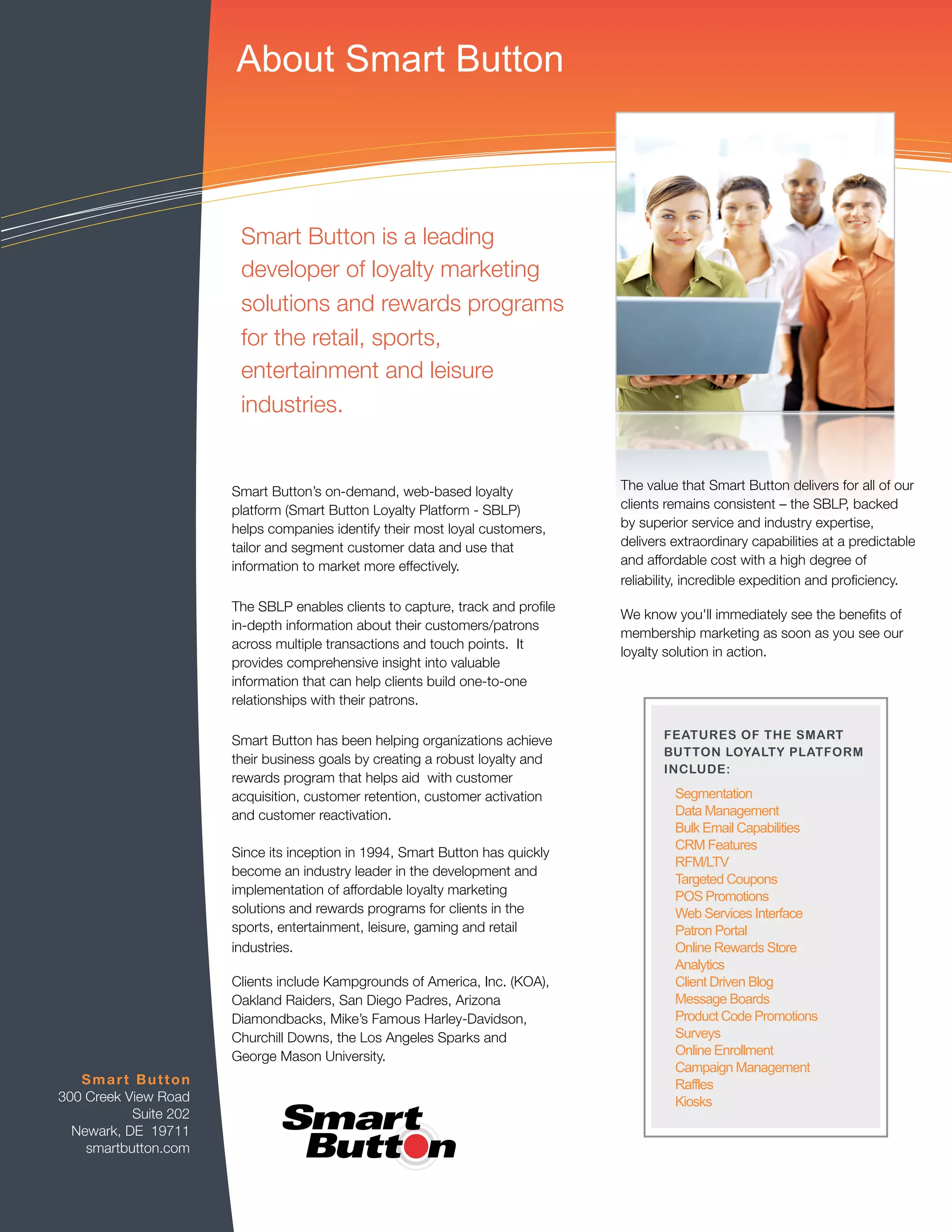 Smart Button is a leading provider of loyalty marketing solutions focused on the retail, sports, entertainment, and leisure industries, offering an affordable, web-based platform to help businesses identify and engage with their most loyal customers. Since 1994, the company has specialized in creating comprehensive rewards programs designed to enhance customer acquisition, retention, and engagement. Their platform provides clients with valuable insights and tools to build one-to-one customer relationships while maintaining ownership of collected data.