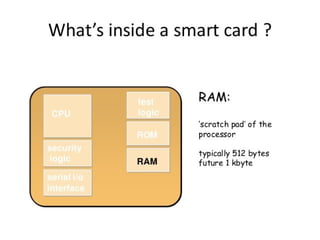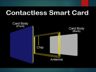 This document discusses smart cards, their history, and applications. It provides an overview of smart cards including their dimensions and components. Smart cards first emerged in the 1970s and are now used widely for applications such as payment, transportation ticketing, healthcare, and identification. The document outlines the growth of smart card usage and shipments between 2006-2016. It describes the two main types of smart card chips and discusses contact and contactless smart cards. Examples of smart card applications include banking, mobile phones, transportation, and loyalty programs. Advantages include flexibility, security, and portability, while disadvantages include potential security issues. The document predicts continued growth in smart card usage through 2020.